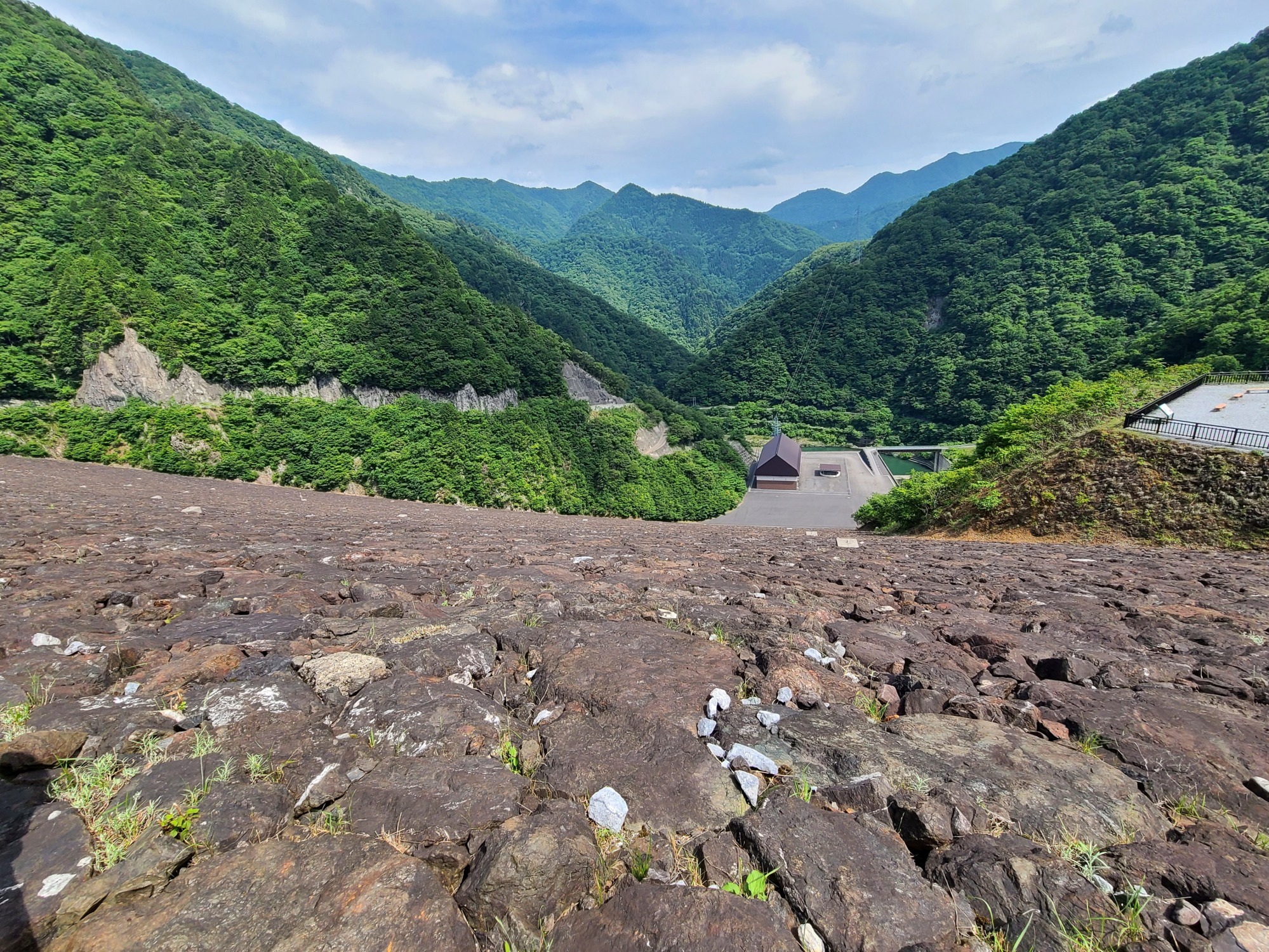 ダム側を見下ろすと、ロックフィルダムならではの積み上げられた岩や石を間近で見ることができます。