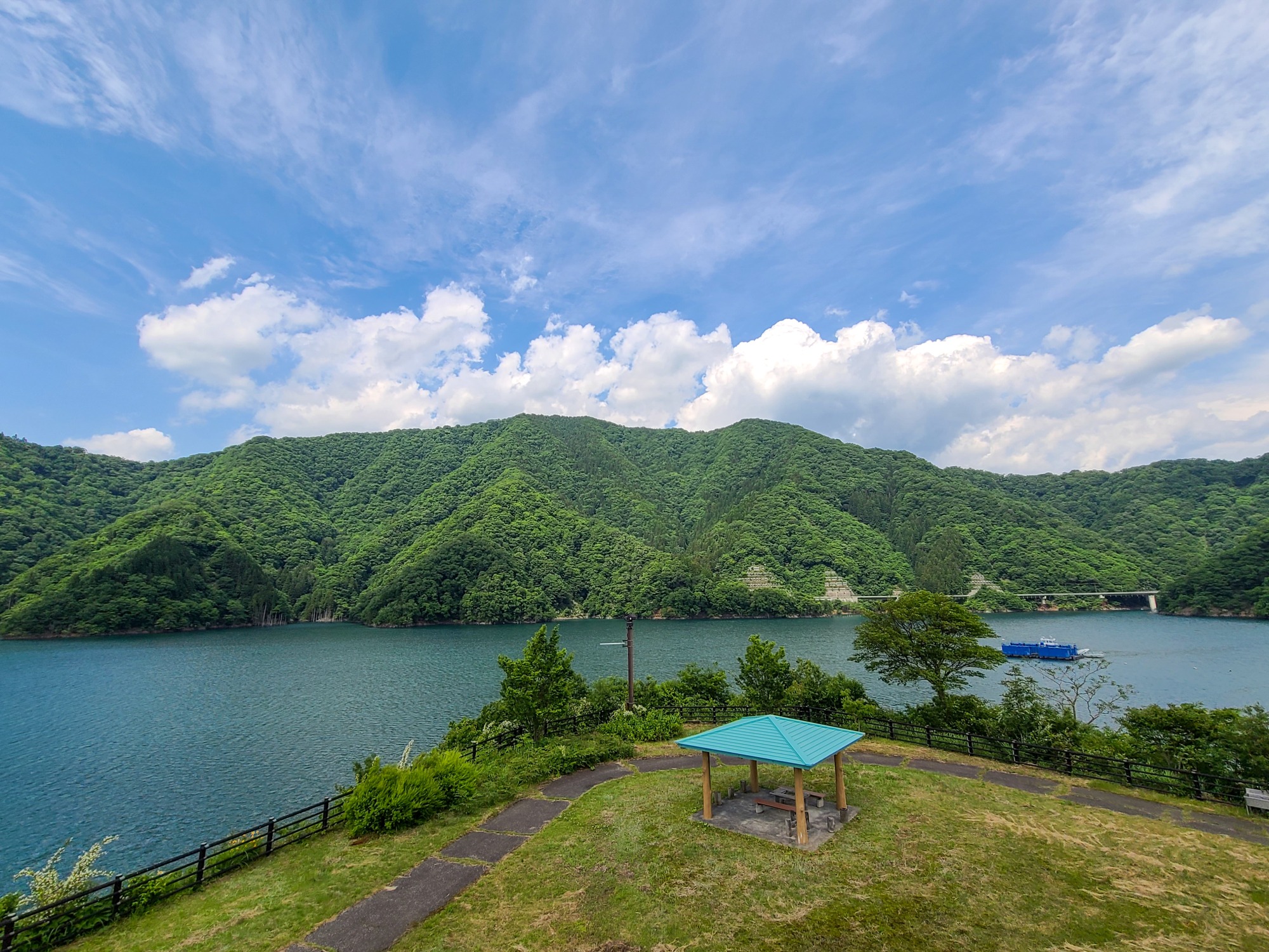 最深部は約120mと言われている徳山湖。満々と水をたたえた光景が見渡せます。