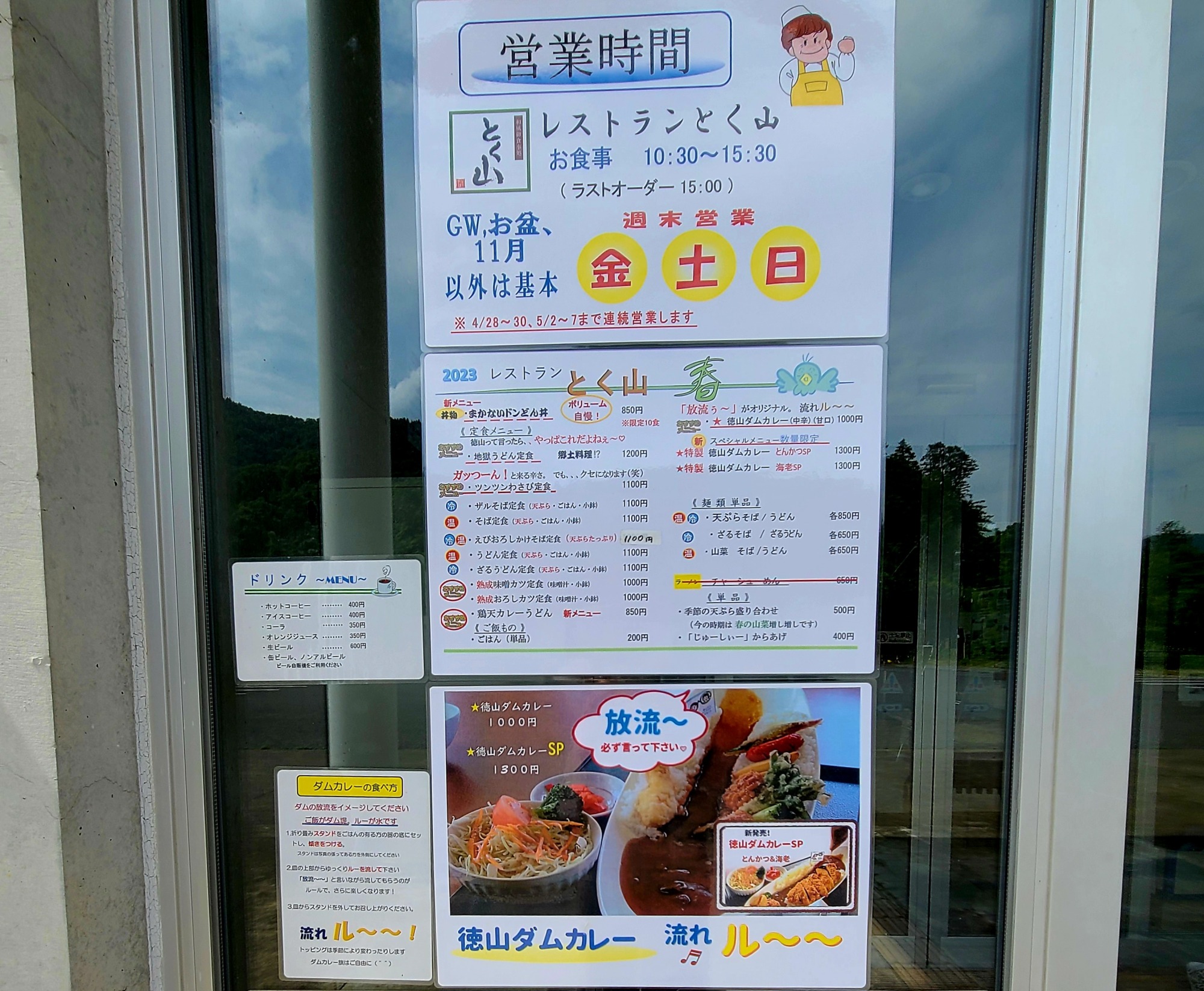 金曜日、土曜日、日曜日のみ営業されている「レストラン とく山」さん。人気メニューは「徳山ダムカレー」です。日曜日にお邪魔しましたが臨時休業でした…。行かれる際は連絡してから向かった方が良いかも!