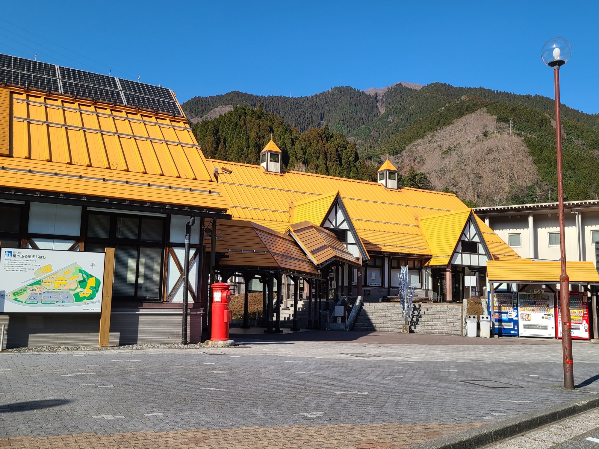 オレンジ色の屋根と可愛らしい洋風な建物が印象的な道の駅「星のふる里ふじはし」。