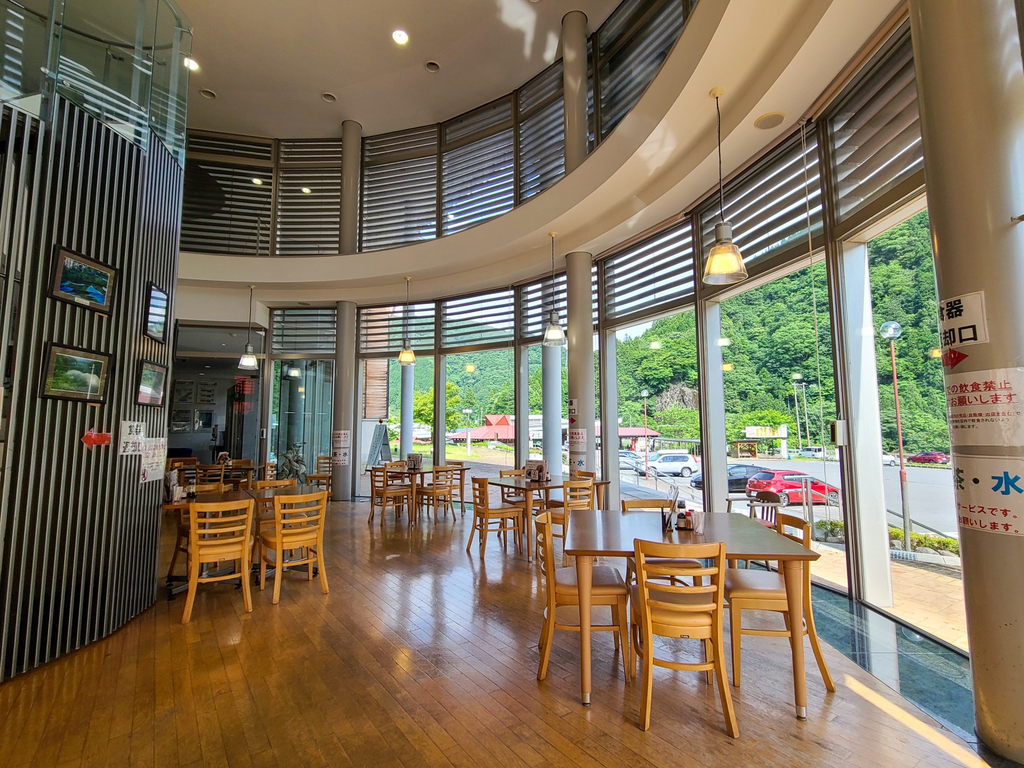 大きな窓から光が入り明るく清潔感があるレストラン。床や家具には木が使われており、癒しの空間でゆっくり過ごせます。