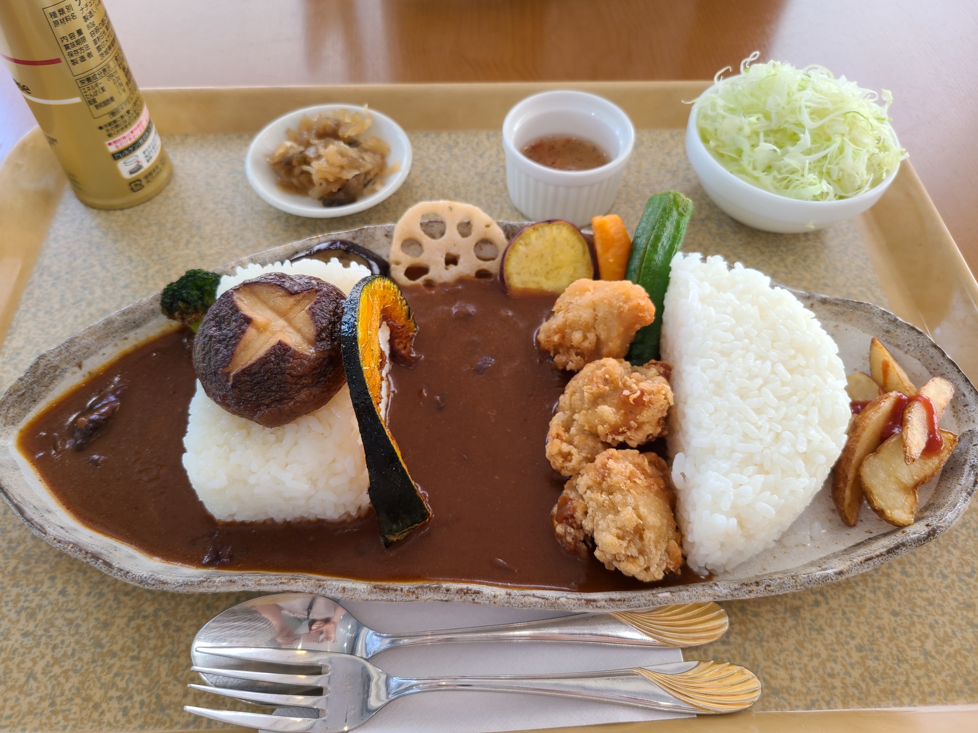 今回は「よことくダムカレー 1,300円」をいただきました!野菜や肉厚な椎茸、唐揚げなどボリュームたっぷり、とてもおいしくて大満足でした。