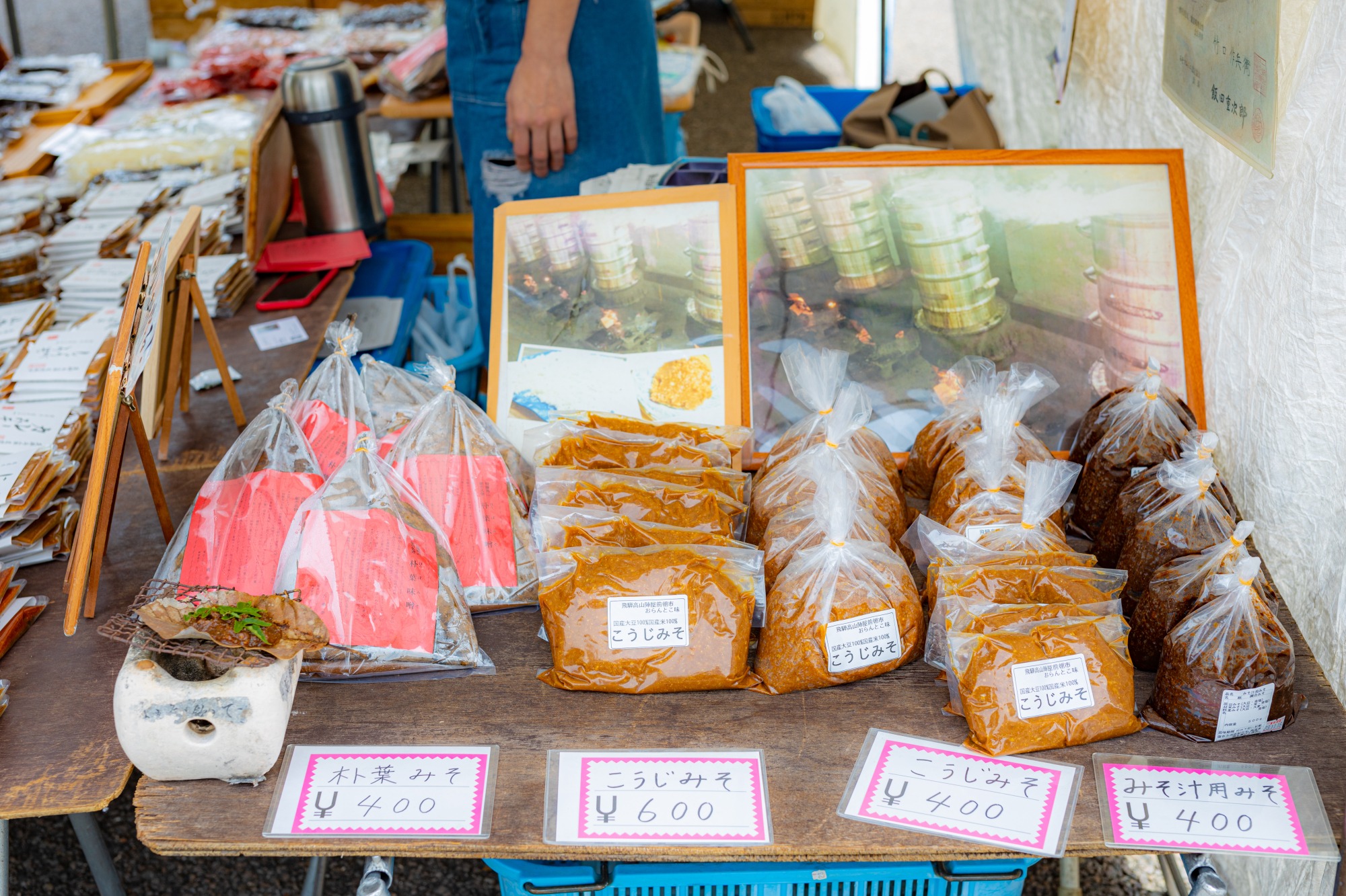 陣屋前朝市にて「陣屋もち」や「三年熟成みそ」、「漬物」などを販売している山腰農園(清助)さん。