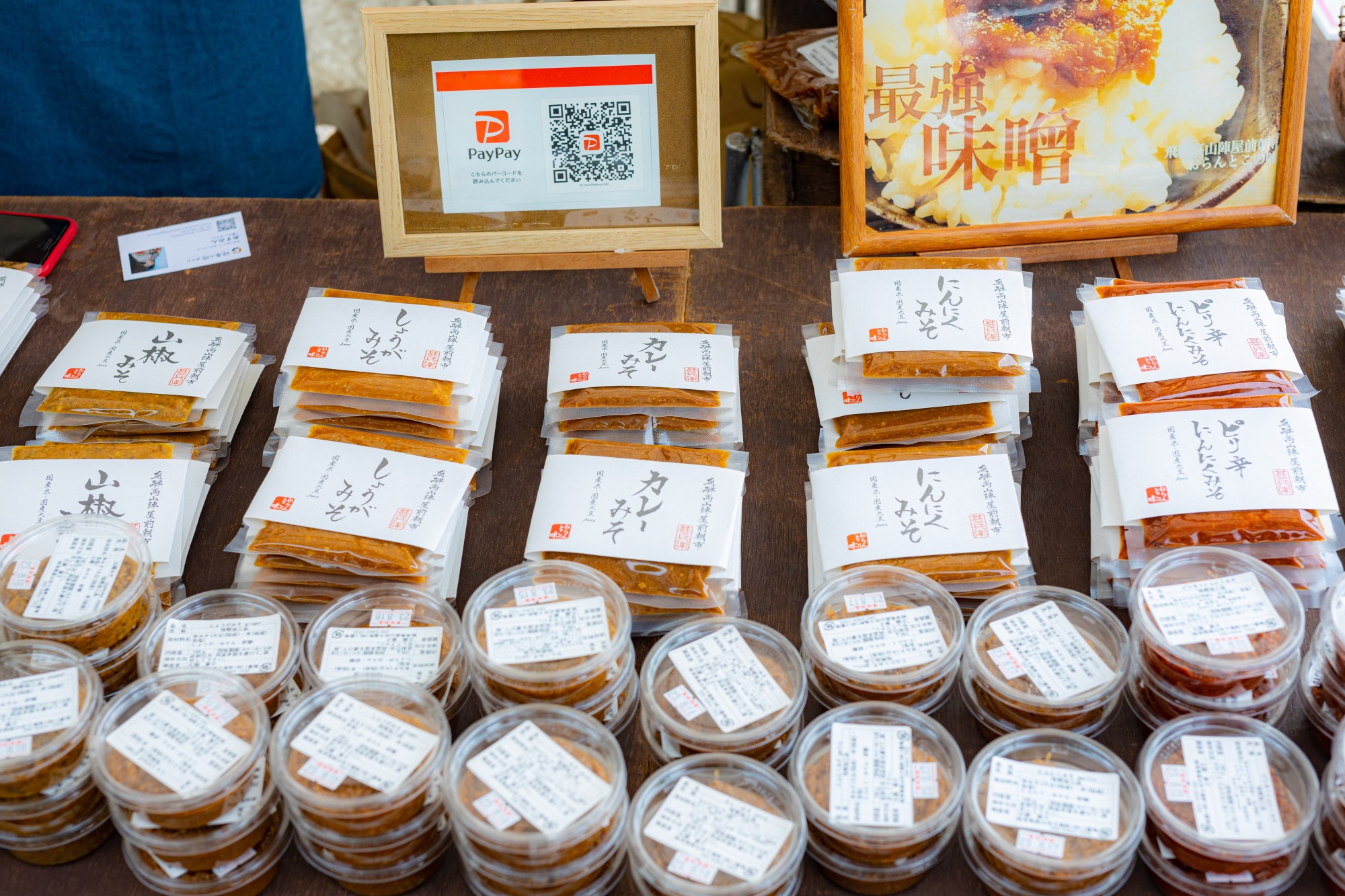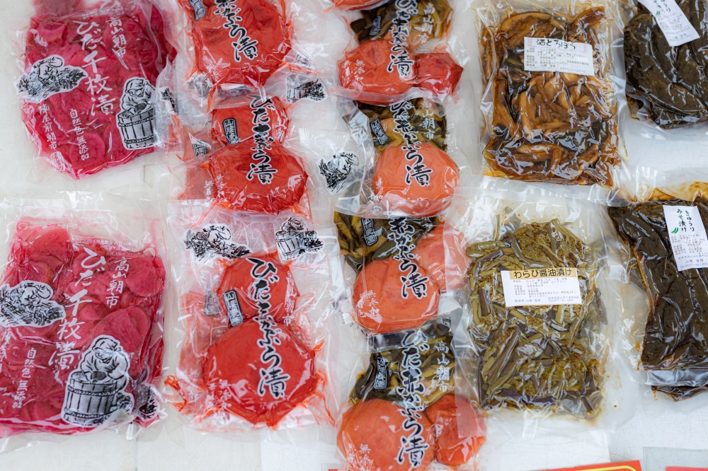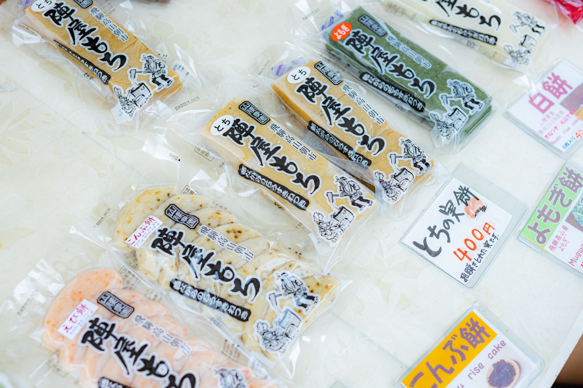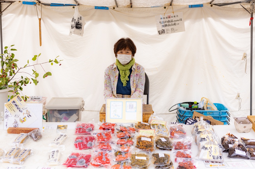 多い時にはそれぞれ30店舗ほどが軒を連ね、春は「山菜や花々」、夏は「飛騨ももや夏野菜」、秋は「飛騨りんごや新米」、冬は「餅や漬物」等々、季節ごとにさまざまな商品が並びます。