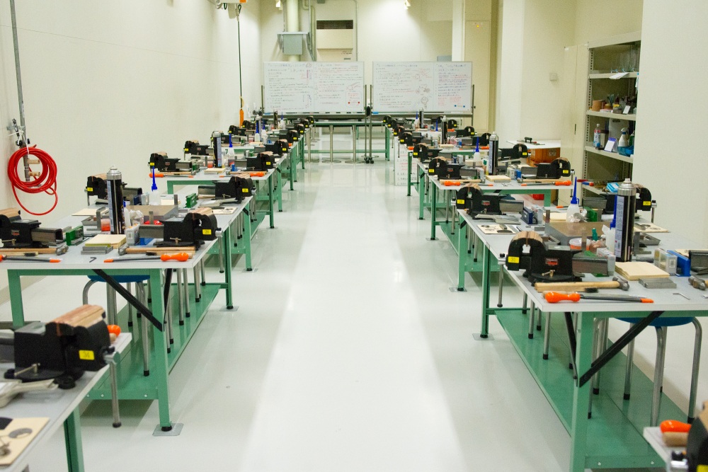 金属加工体験をする部屋は広く、作業テーブルがいくつも並んでいます。その作業テーブルの上には数種類の工具が綺麗にセットしてあり、無意識のうちに製作意欲が湧いてきました。教えてくれる先生は金属加工のスペシャリストで、優しく教えてくれました。出来上がる作品は本格的な質感で子供たちも大満足!