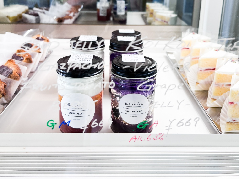 人気のキャロットケーキをはじめ、ボトルスイーツなどが店頭にずらり。お酒が入っていたり、スペインのガスパチョのイメージでつくられたゼリーや黒ビール、ギネスベースのこっくり苦いゼリーにマリネしたアメリカンチェリーを合わせたナイトデザートなど、素材の組み合わせにあっと驚く逸品が次々と生み出されています。