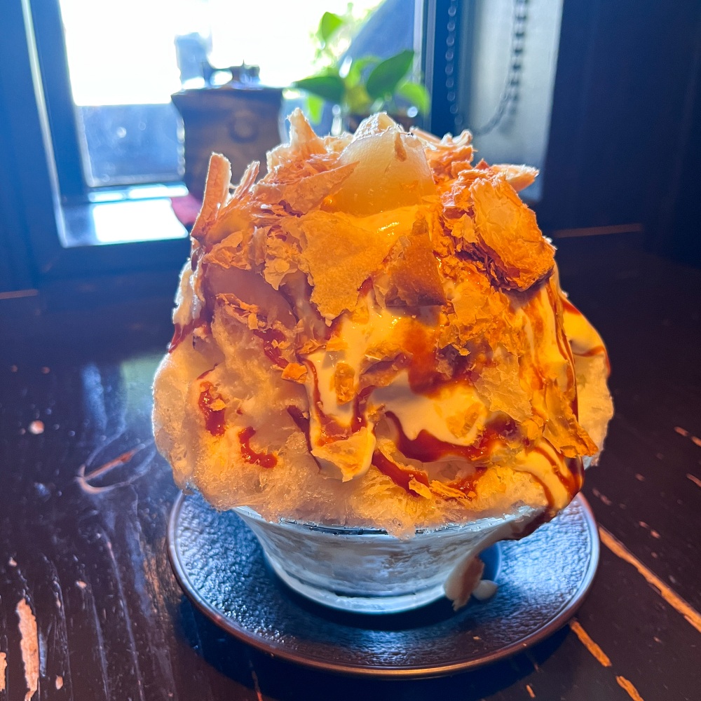 店でかき氷がいただけるのは毎日13時から。店内の看板にその時いただくことができるかき氷のメニューが書かれていて、そこから選ぶシステムです。写真は「アップルパイ(チーズトッピング付き)」。さくさく食感のパイが氷の上に散りばめられて、煮詰められたりんごと一緒に食べると、冷たくて美味しいアップルパイを食べているかのよう!チーズの濃厚さも合わさって口の中で感動が広がりました。