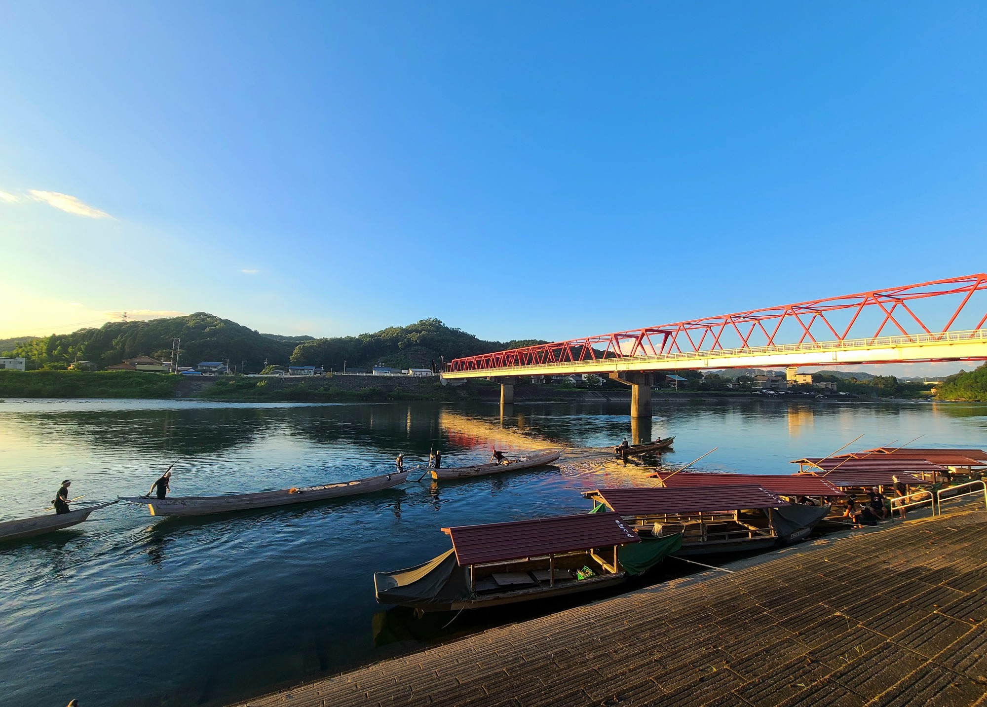 「鮎之瀬橋」下から観覧船に乗船して上流に向かいます。この橋はNHK連続テレビ小説のロケ地に使われた橋としても有名です。