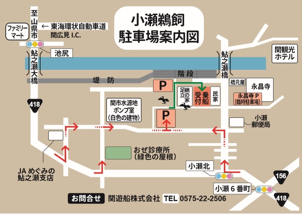 小瀬鵜飼の観覧船乗船場は、赤い橋「鮎之瀬橋」からすぐの場所にあります。