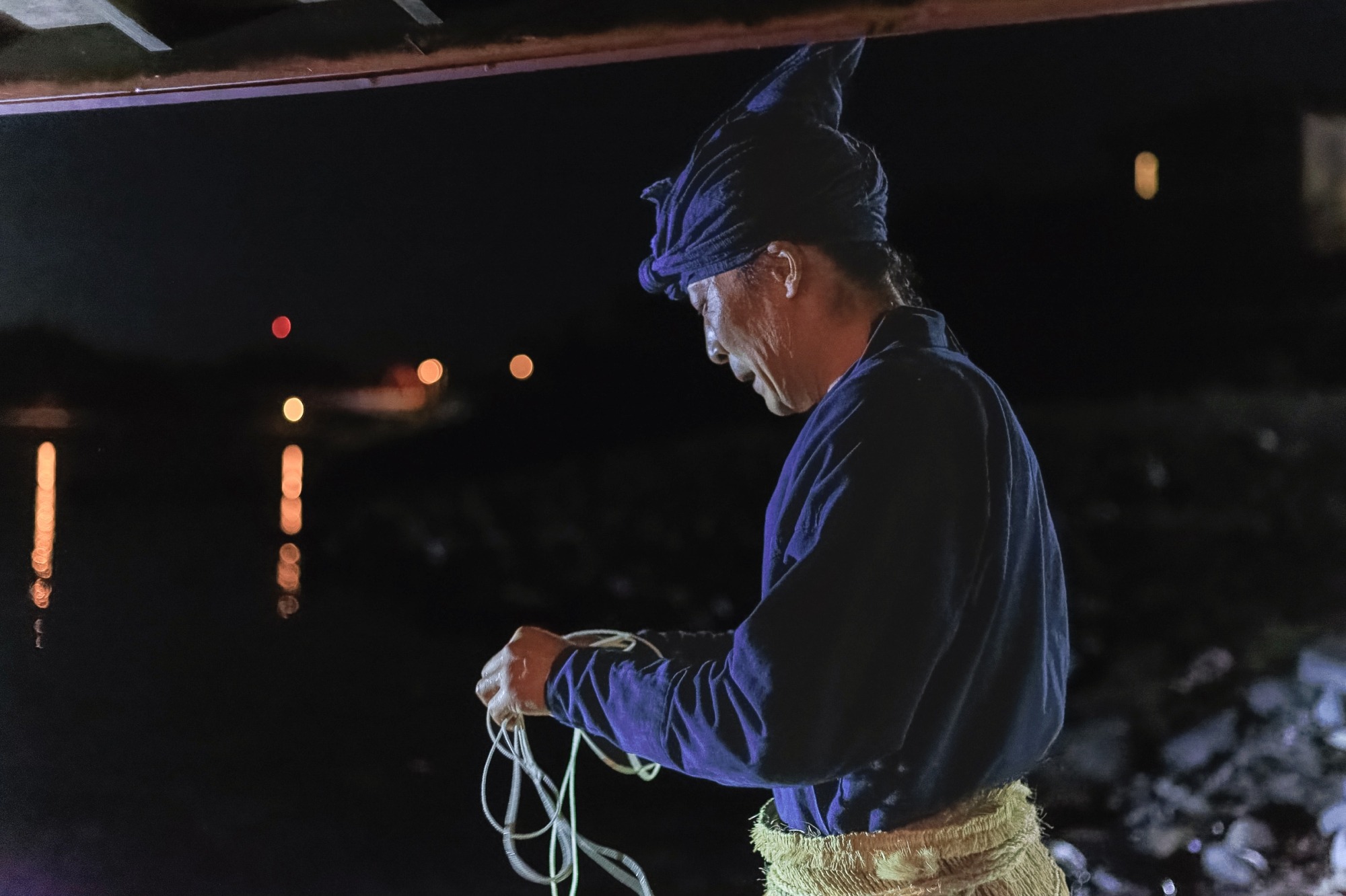 暗くなるまでの間、鵜匠さんが狩り下りの順番を決め、かがり火の火を起こし、鵜に手縄付けなど鵜飼のまわしをします(まわし→関の方言で「準備」)。