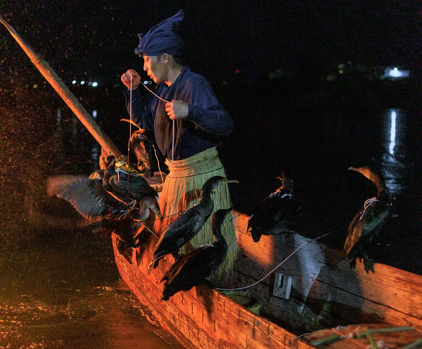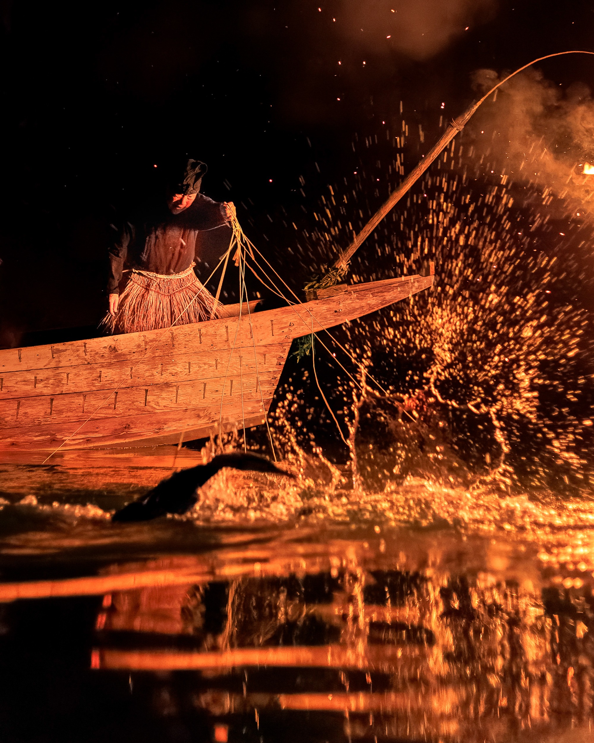 かがり火に照らされた水飛沫。漁をする鵜の躍動感を感じられます。