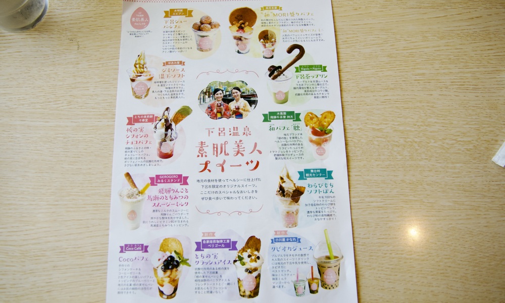 下呂温泉のマップを見ると、スイーツの情報が。「下呂温泉 素肌美人スイーツ」は特に目を引かれたので、この情報を元に回ってみることにしました!