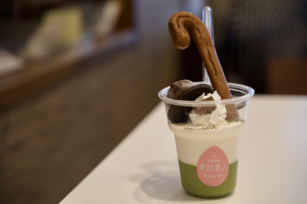 ネーミングが下呂らしく、チャップリンと掛けてあったこちらの「下呂茶ップリン」をいただくことに。