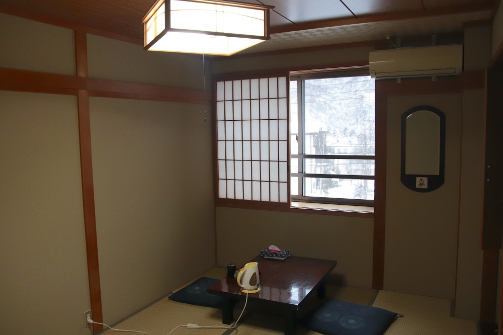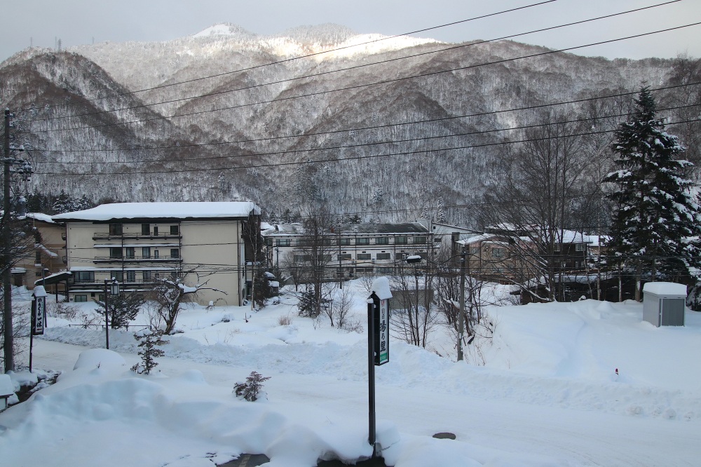 お部屋は7.5畳ですが、一人旅では十分すぎる広さ。窓の外に広がる平湯温泉の雪景色も見事でした。チェックインしたら、荷物をおろしてホッと一息つくこの余白の時間こそ、一人旅ならではの癒しのひとときです。