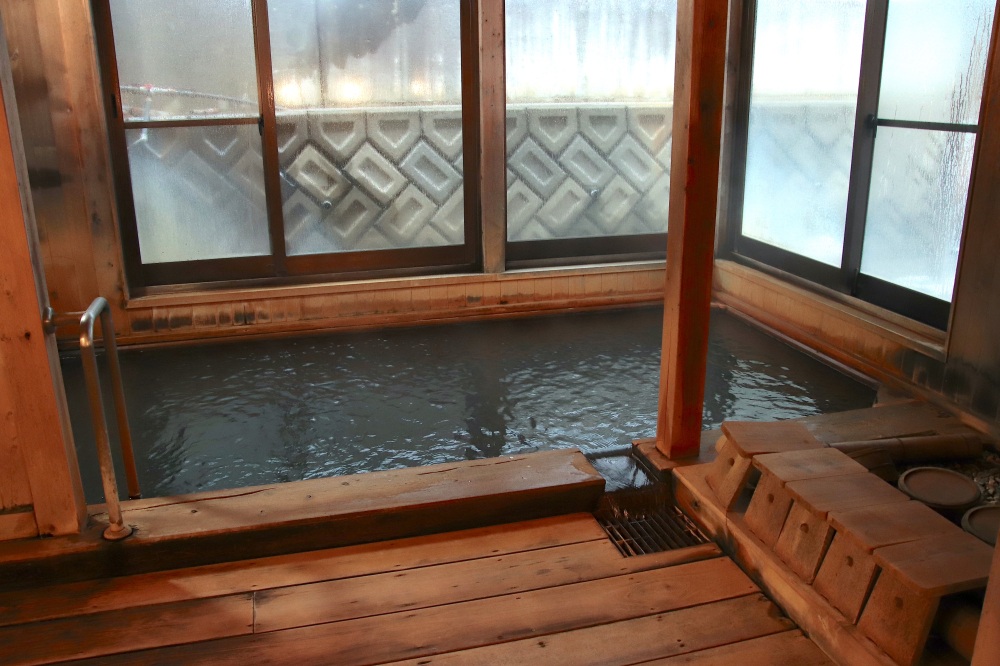 まず内湯がこちら。ご主人が自ら作り上げたという浴室は、そのほとんどがヒノキ造り。木の香りと硫黄泉のにおいが混ざり合って、心地よい香りに包まれます。