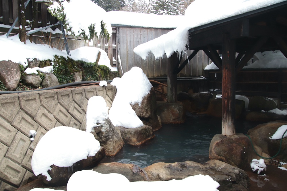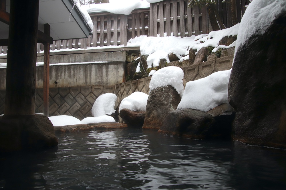 内湯のほかに露天風呂も備えています。これが自然石を配した野趣ある作りで、なんだか隠れ家感がありました。外はしんしんと雪が降り、まるで水墨画のような白と黒の景色。秘湯らしい時間を楽しみます。