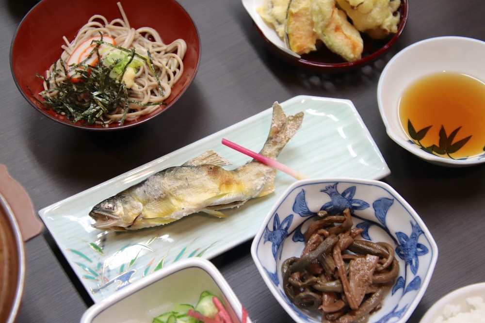 品数も十分!飛騨牛の陶板焼や岩魚の塩焼き、山菜のてんぷらやお刺身など、メインをはれるお料理が盛りだくさんです。お米もたらふく出していただき、もりもりいただいてしまいました!