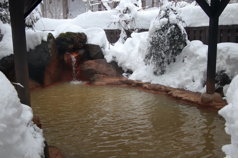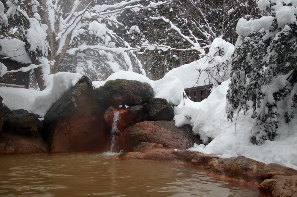 野趣あふれる岩造りの浴槽に、こんこんと源泉がかけ流しされており、秘湯らしさが格別!雪景色も美しく、まさに自然に抱かれるような入浴にふけることができます。鉄分の香りを感じる濁り湯でリフレッシュしながら、来年一年の抱負を考えていました。