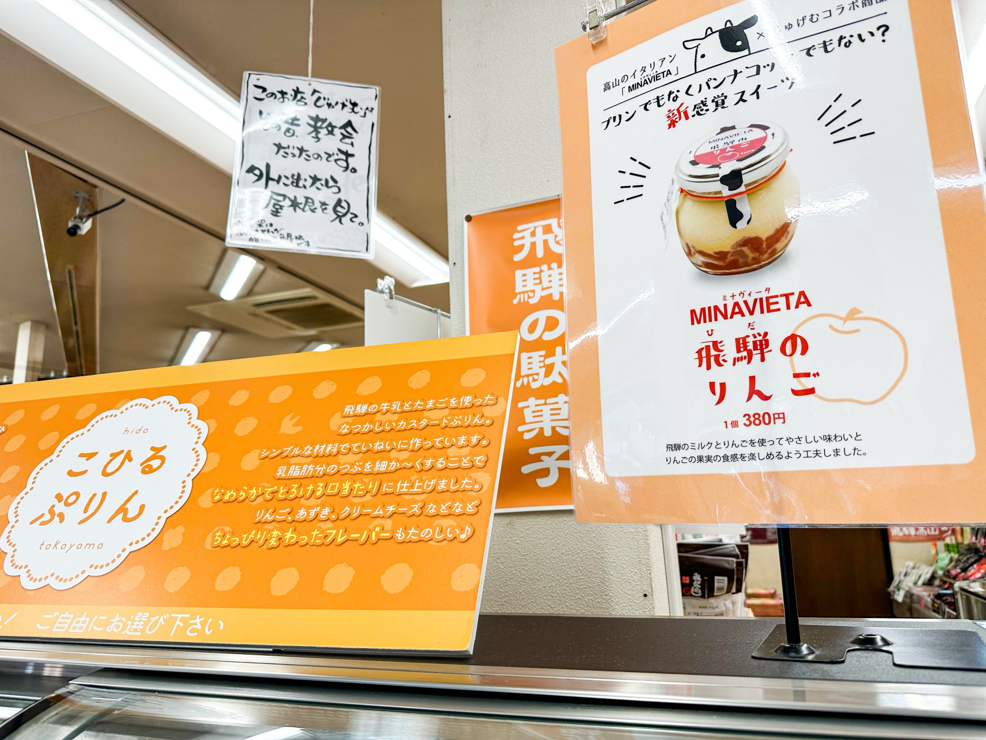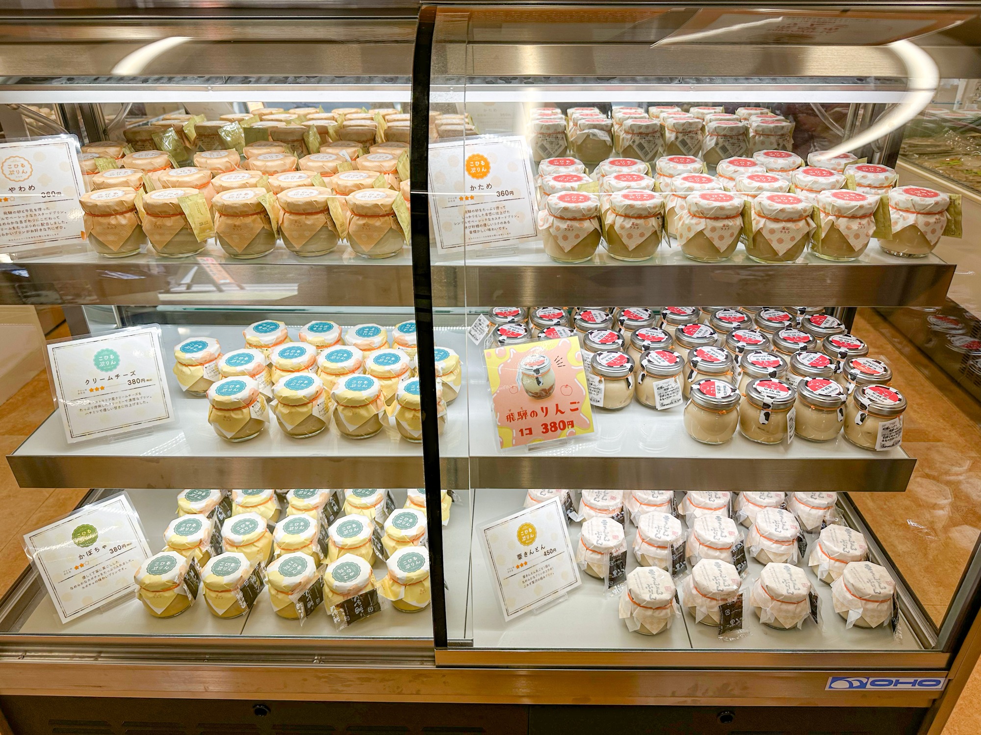 店頭で販売している飛騨牛串焼きや飛騨牛コロッケがとても人気のお店ですが、店内に入ってみたところ、とても美味しそうなプリンが並ぶ棚を発見!