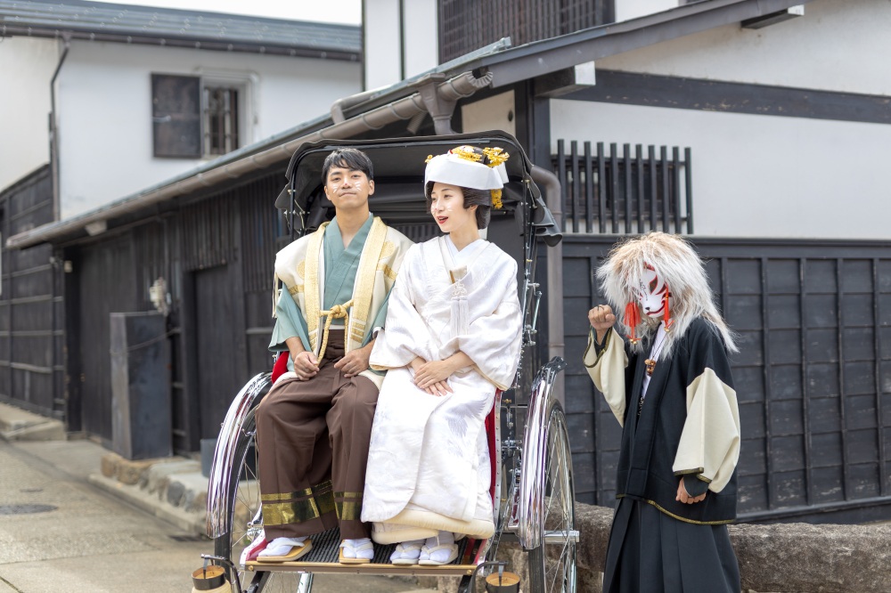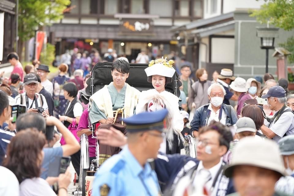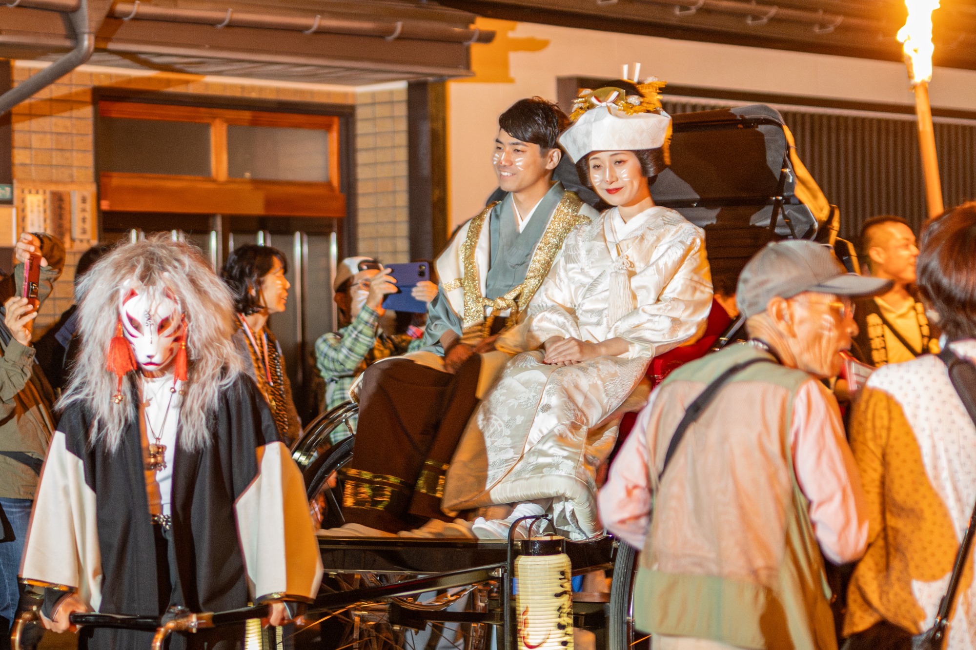 飛騨古川に古くから伝わるおとぎ話が元になっており、きつねの花嫁・花婿(結婚を予定しているカップルやご夫婦等)を中心にまちなかを練り歩く、幻想的な嫁入り行列が見どころです。