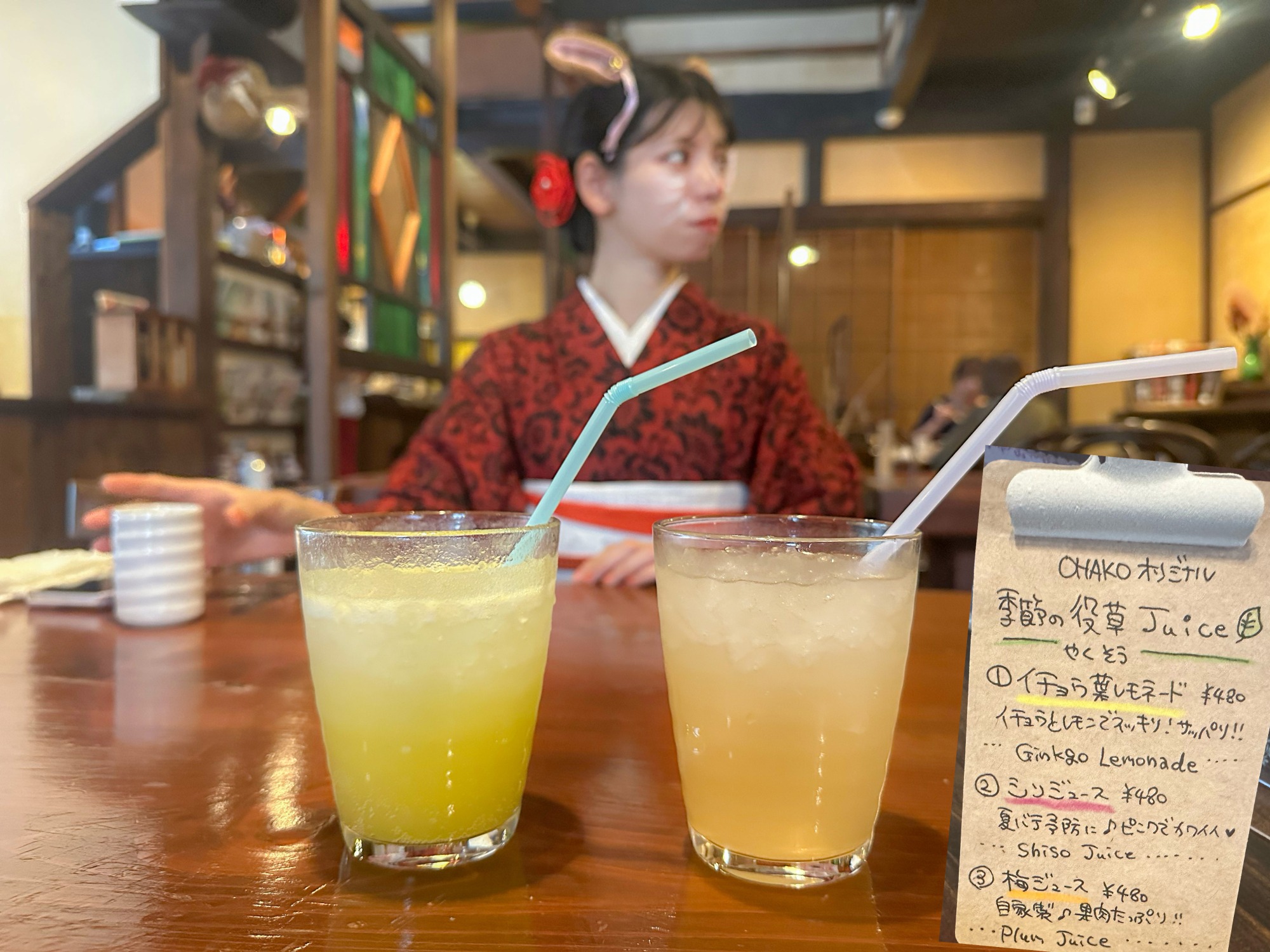 私は可愛いきつねさんと一緒に「季節の役草juice」をいただきました!