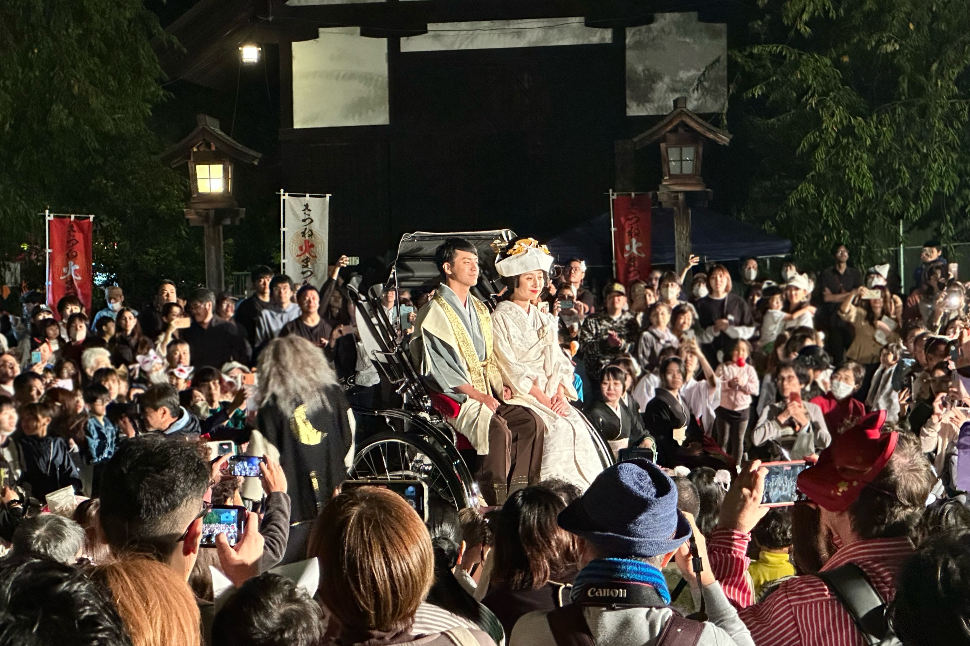 きつね火まつりが最高に盛り上がりを見せるのは夕刻。太鼓や鈴などの鳴り物と共に飛騨古川の街中を厳かに練り歩く「嫁入り行列」は、まつり広場へ入り、婚礼の儀へと移ります。