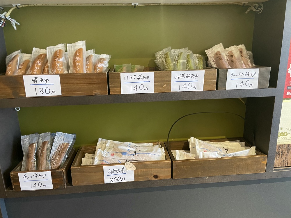 カステラ生地に求肥のみが入ったオーソドックスなものから、粒あん入りのもの、いび茶・いちご・ブルーベリー・チョコなど、岐阜の特産品を鮎菓子にしたものが揃うのはココだけ。鮎菓子の中の求肥のみを商品にした「鮎菓子の餅だけ」も人気商品。
