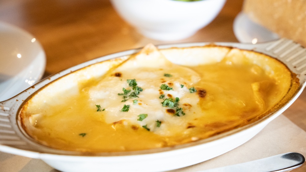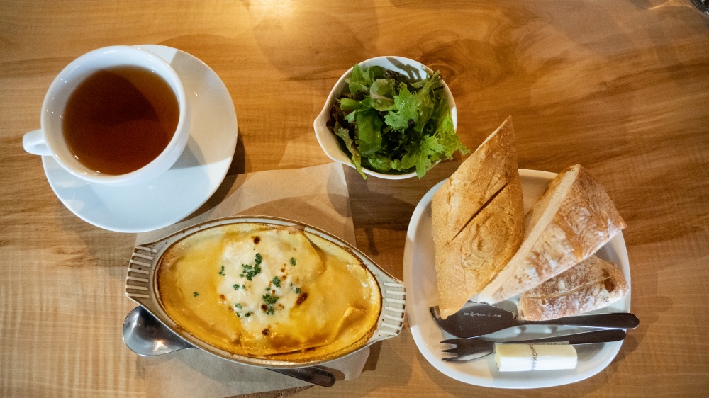 こちらは、ラザニアセット。パンのお供としてオリーブオイルまたは無塩バターが選べます。今回は無塩バターでいただきました。