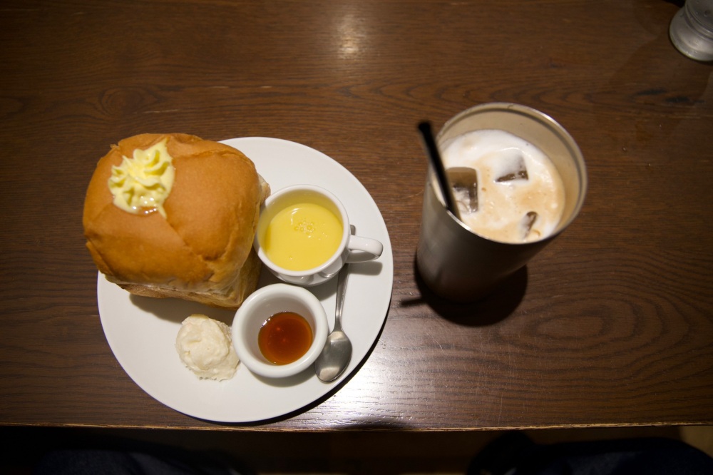 僕が選んだのは、ドリンク代だけでパンとコーンスープ、ポテトサラダ、メープルシロップがついてくる「しょぱんセット」。
