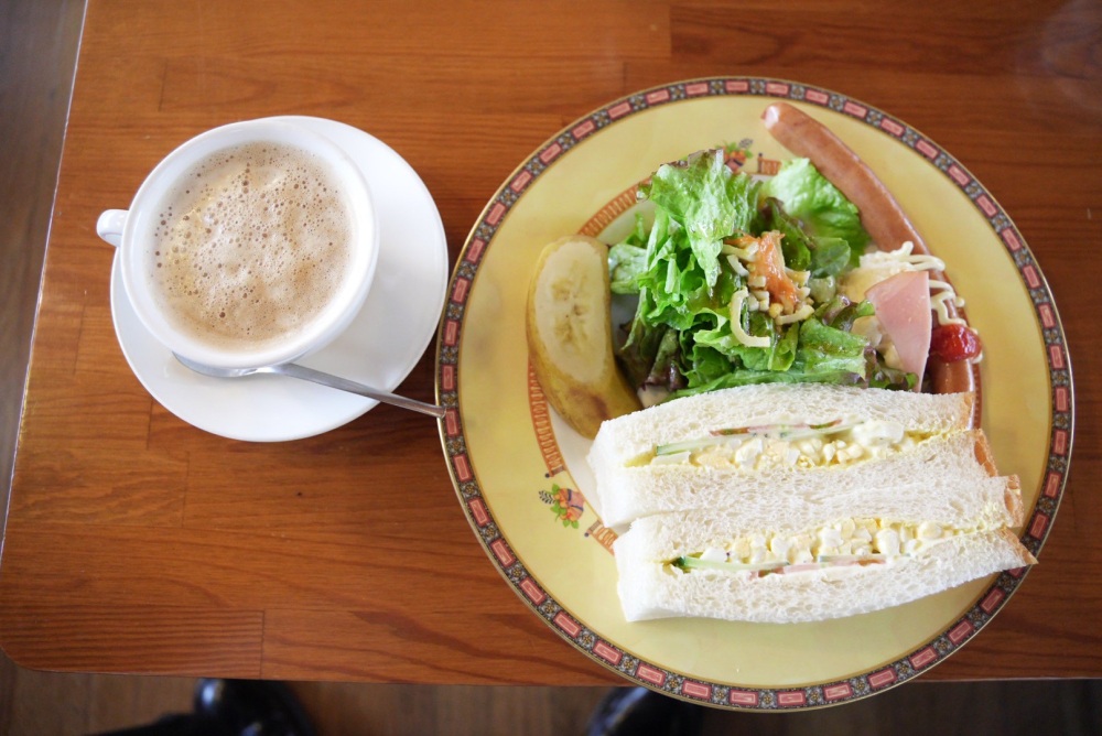 ドリンク代のみでトーストとミニサラダが付くモーニングもあったのですが、ドリンク代に+380円の厚切りトーストセットと、+550円のサンドイッチセットをチョイス。