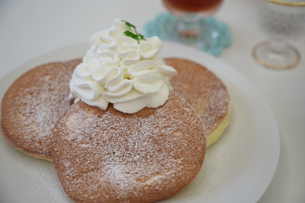 ふわふわなパンケーキに生クリームがたっぷりトッピングされていて、ボリュームたっぷりの見た目ですが、ペロリと食べられてしまいます。