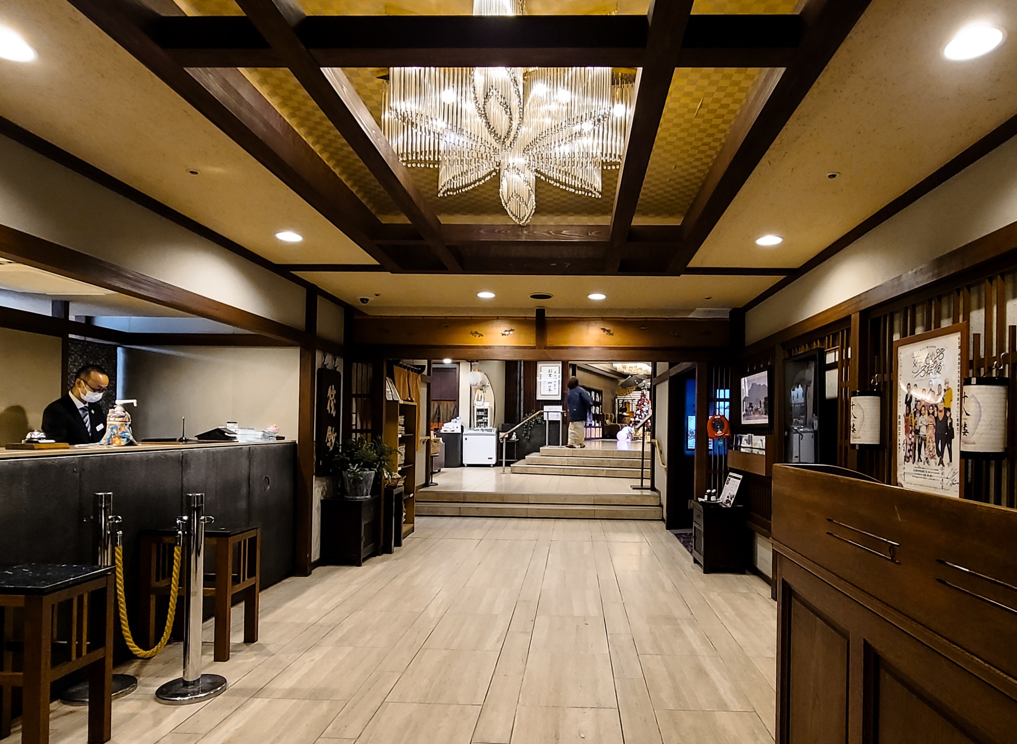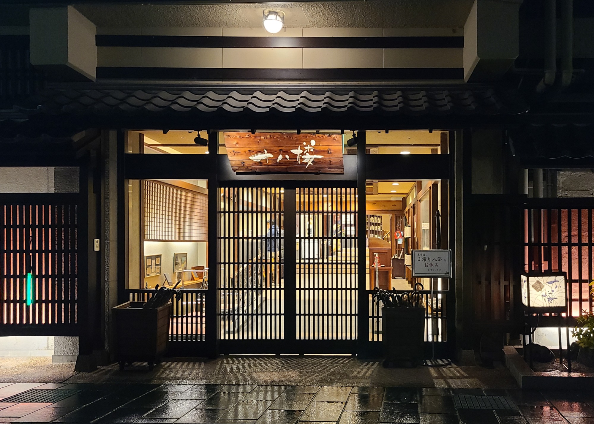 昔ながらの日本家屋が軒を連ねる川原町の古い町並み沿いに、十八楼さんのエントランスがあります。