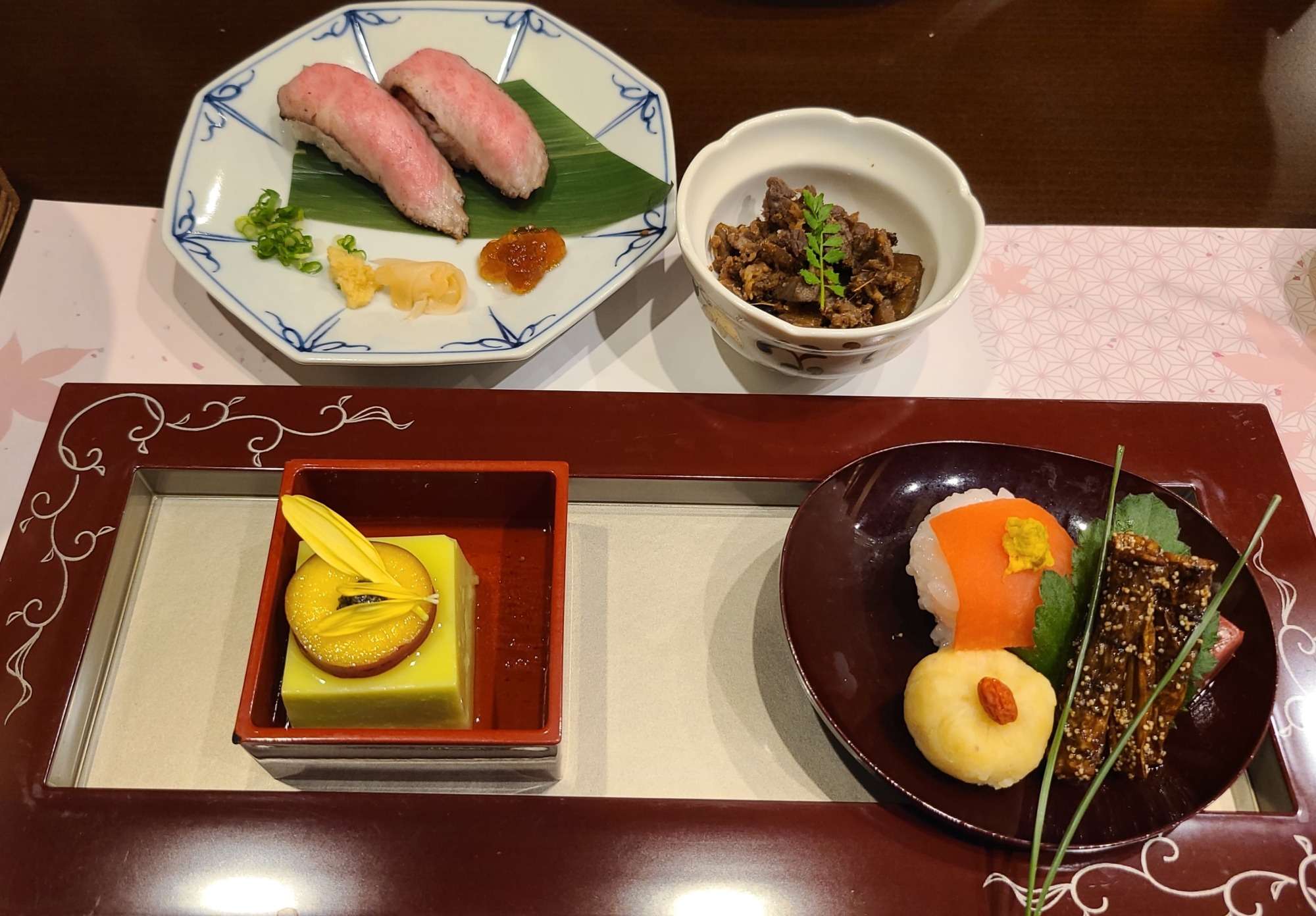 飛騨牛もも握り寿司と前菜(銀杏豆腐や飛騨牛時雨煮など)。