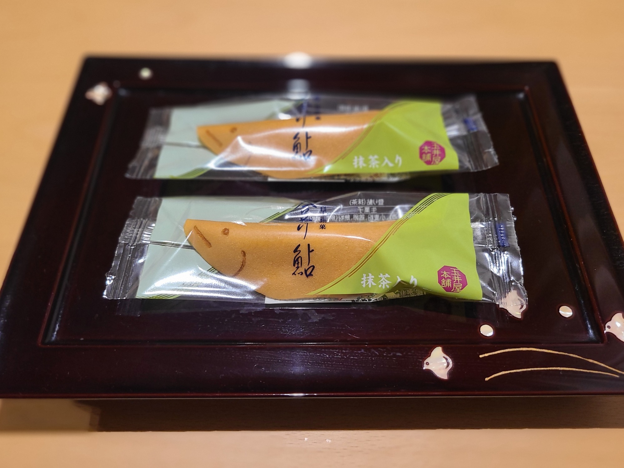 上質なカステラ生地でお餅(求肥)を包んだ鮎菓子。毎朝出来立ての鮎菓子がお部屋に用意されています(御菓子司 玉井屋本舗さんの「登り鮎」)。