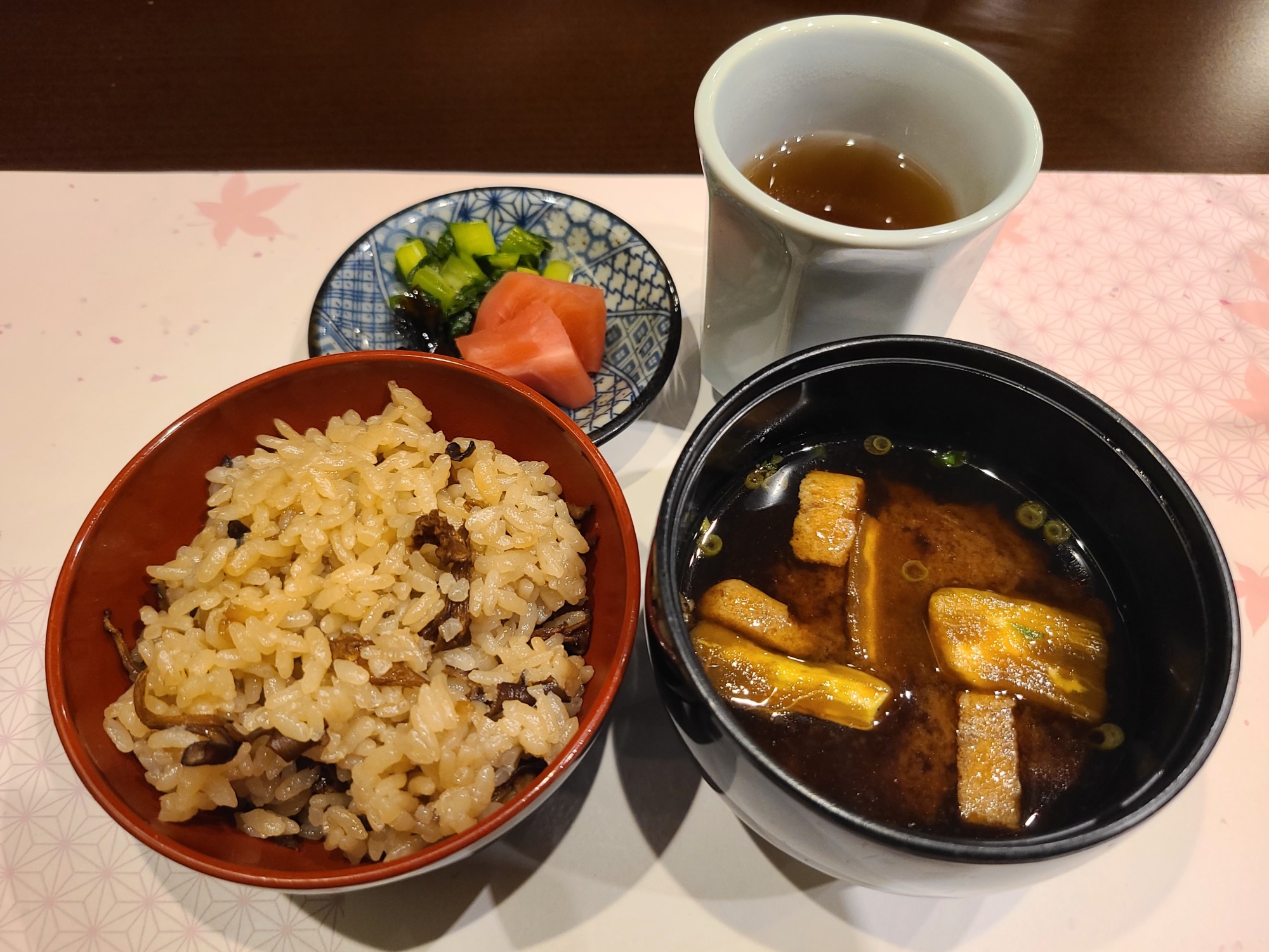 季節の炊き込みご飯と赤だし、飛騨美濃伝統野菜(飛騨紅かぶの赤かぶ漬け、山葵昆布、野沢菜)。