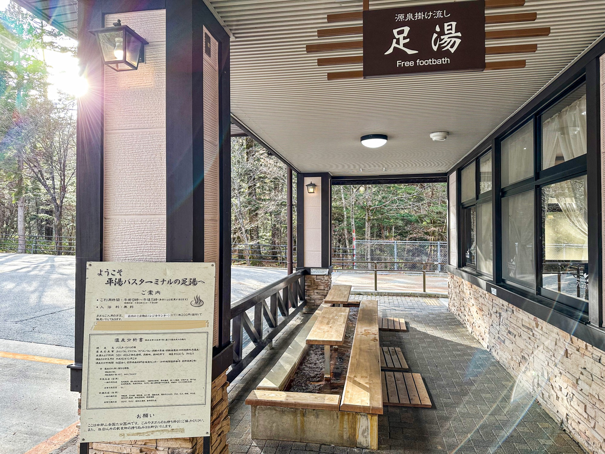 平湯バスターミナルから徒歩5分ほどの場所にある「平湯温泉足湯」は、24時間どなたでも入ることのできる足湯です。