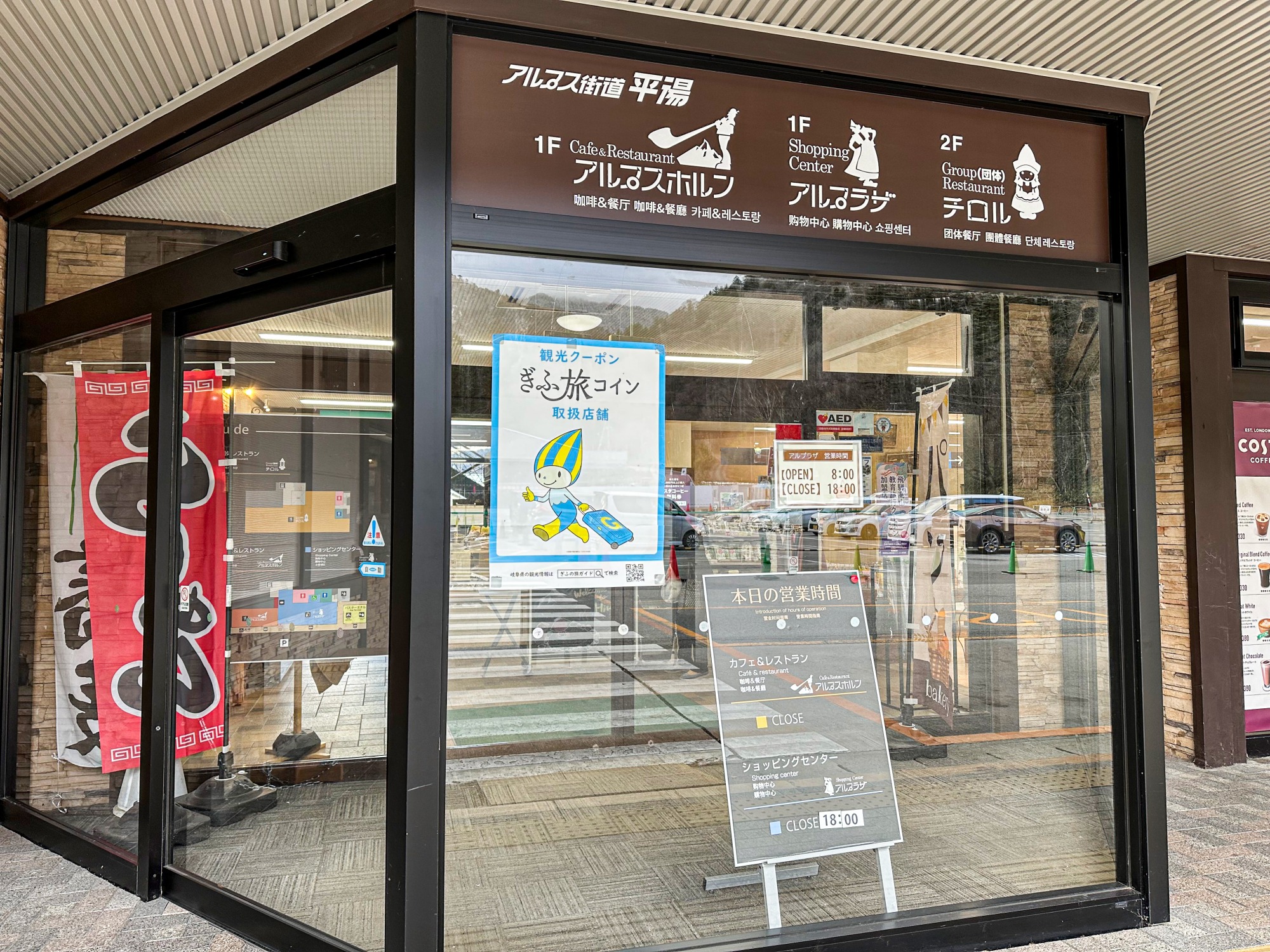 バスターミナル併設の「アルプス街道 平湯」には、レストランやショッピングセンターなどが入っており、飛騨のお土産を購入することができます。