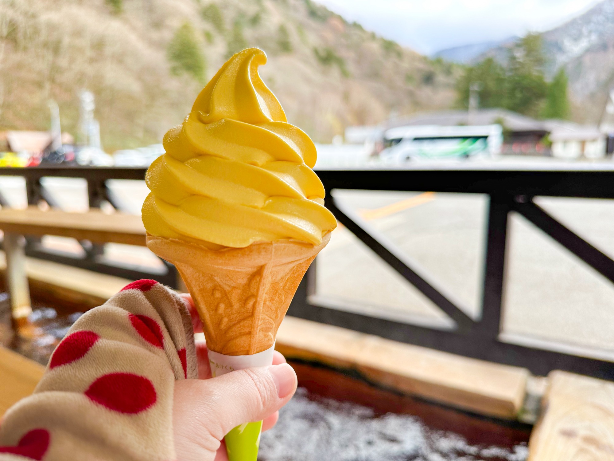 私は、店内のレストラン「アルプスホルン」さんで人気だという「飛騨パイン牛乳ソフトクリーム」を店員さんから教えていただき、足湯に浸かりながら美味しいソフトクリームをいただきました!