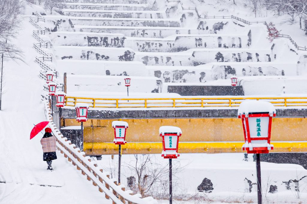 近くの「洞谷流路工」は、春は桜の名所、冬はカラフルな橋と雪のコントラストが映える撮影スポットになっており、冬季(2023年12月下旬~2024年2月29日、17時〜23時)は、降り積もった雪がライトアップされ、幻想的な情景をご覧いただけます。