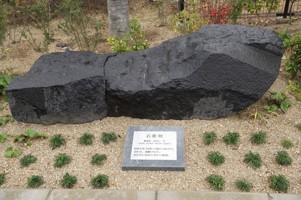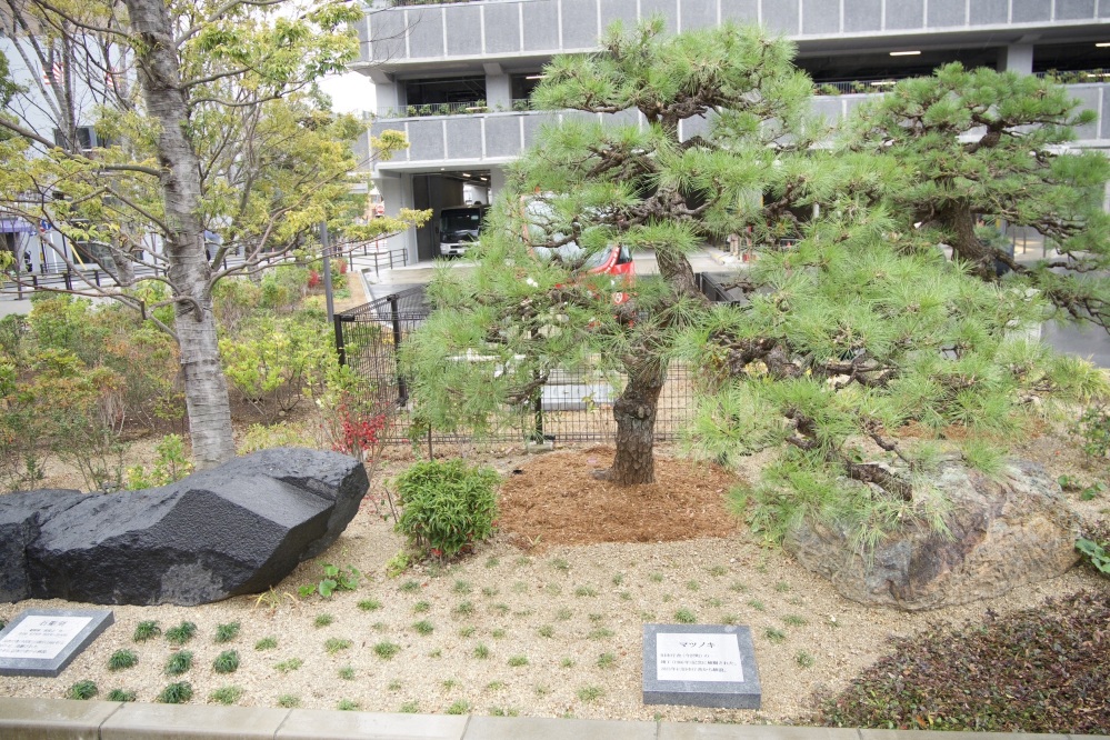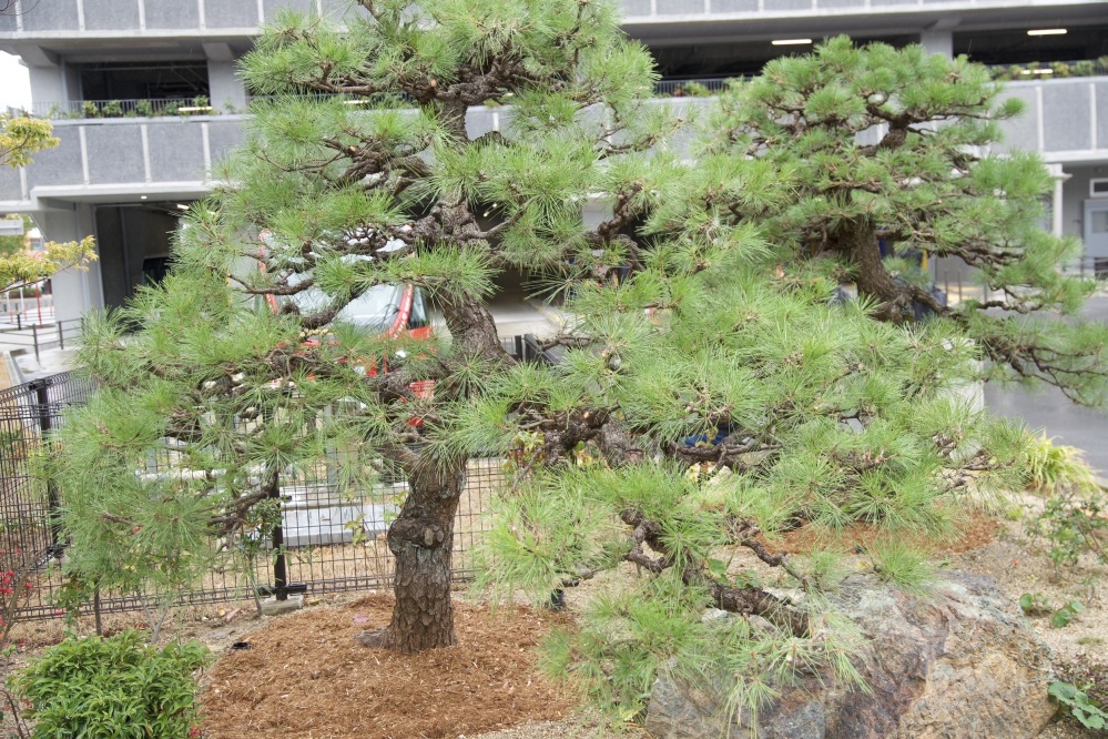 バスを待っている間に、とても立派な松の木を見つけました。その隣には石彫刻も。旧市庁舎にあったものを移設したようです。