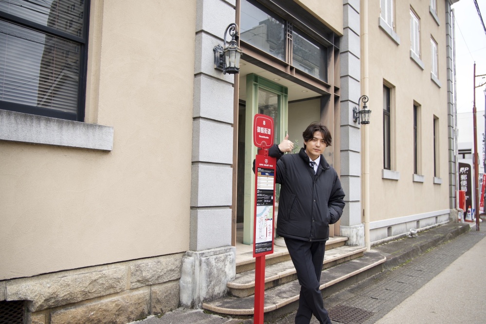 バス停、バスのデザイン、ロゴなどは、JR九州のクルーズトレイン「ななつ星 in 九州」など、公共交通のデザインに数多く携わる水戸岡鋭治氏によってデザインされたもの。