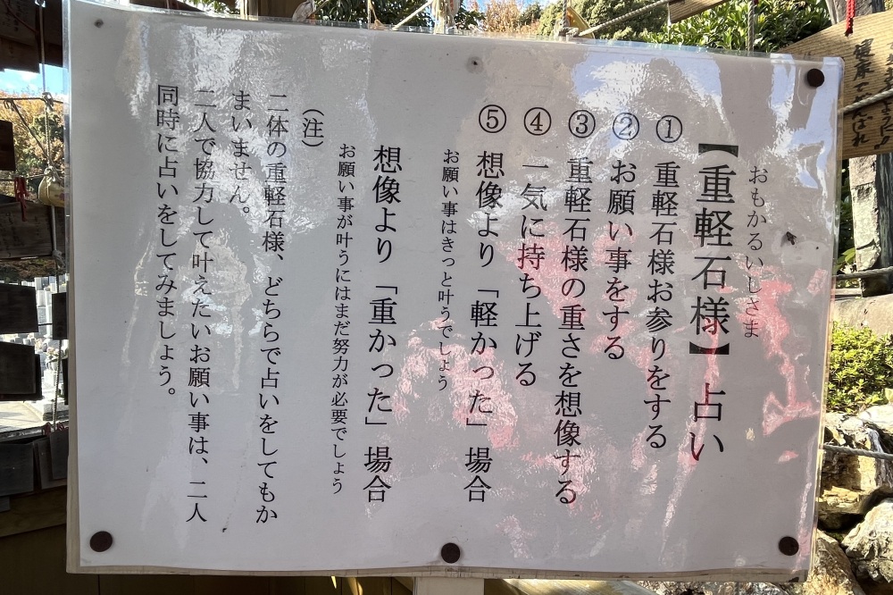 境内には重軽石様があり、願い事をした後、石を持ち上げて「想像したよりも軽い」と感じたら願い事が叶うというもの。
