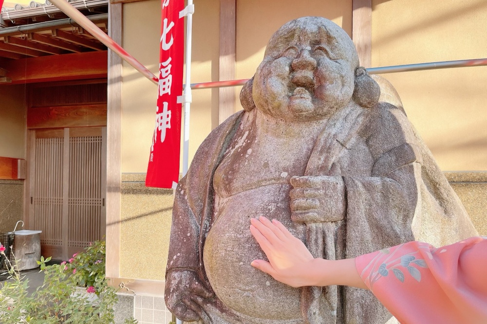 布袋尊に合掌、礼拝をした後、お腹に触れて、長寿・健康を祈ります。嫌なことは袋にしまっていただき、福徳を得ましょう。