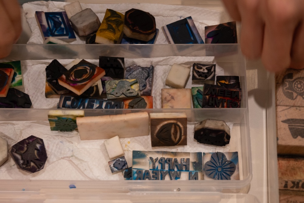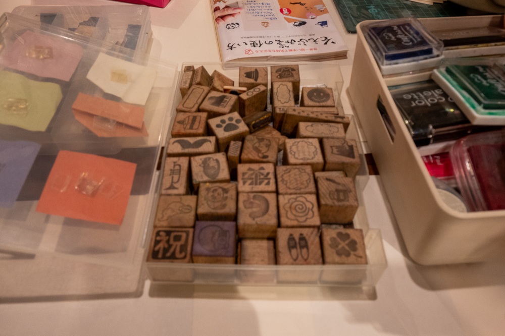 作業をする机は4人用でした。無地のそえぶみ箋に、自分の好きなスタンプを打っていきます。スタンプのインクも種類が豊富でしたよ。
