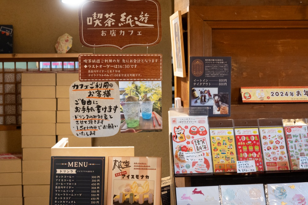 店内には美濃和紙の雑貨など、本当に可愛いものがたくさんあります。お土産選びが楽しくて、思った以上に早く時間が過ぎてしまいました。夢中でそえぶみ箋作り・お土産選びをした結果、この日のお昼御飯は14時からになっていました。いや~、楽しい時間は過ぎるのが早い。