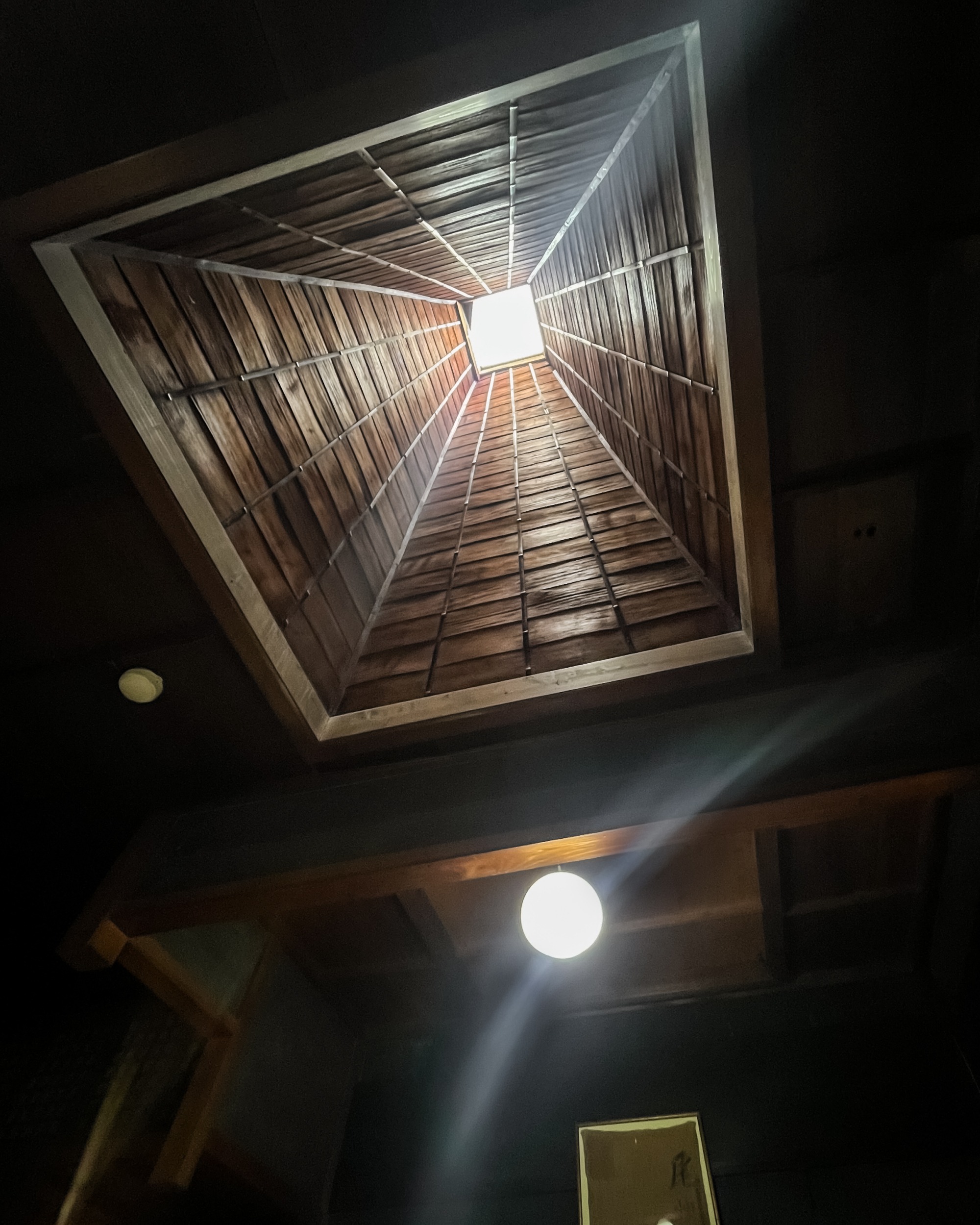 天井から空に向けて切り取られた約3メートルある明かり取り。明かり取りから差し込む優しい自然光が印象的でした。