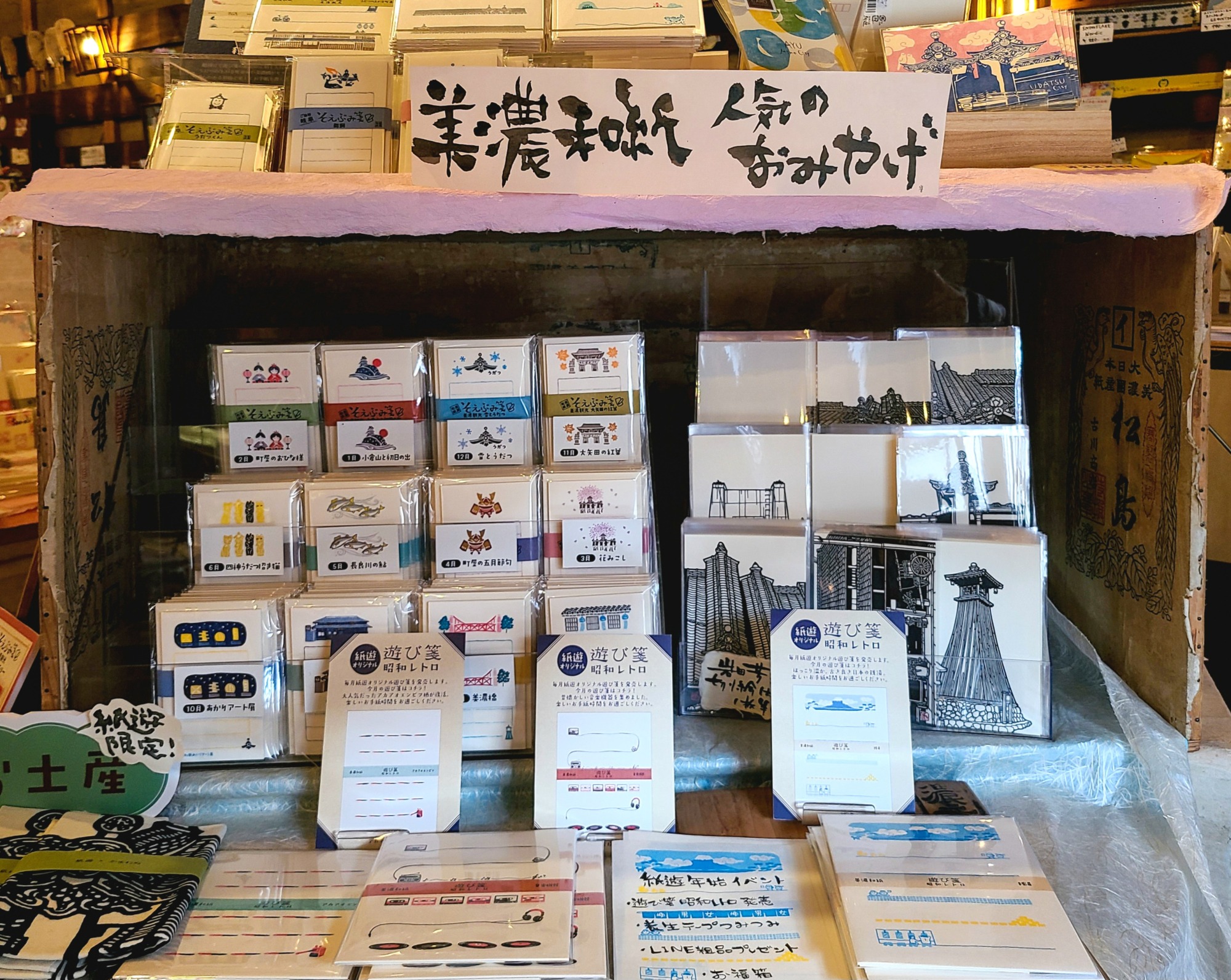 人気のお土産「そえぶみ箋美濃観光シリーズ」は、そえぶみ箋15周年にちなんで発売されました。美濃の街をテーマにした季節感あふれる特別なそえぶみ箋です(全12柄)。