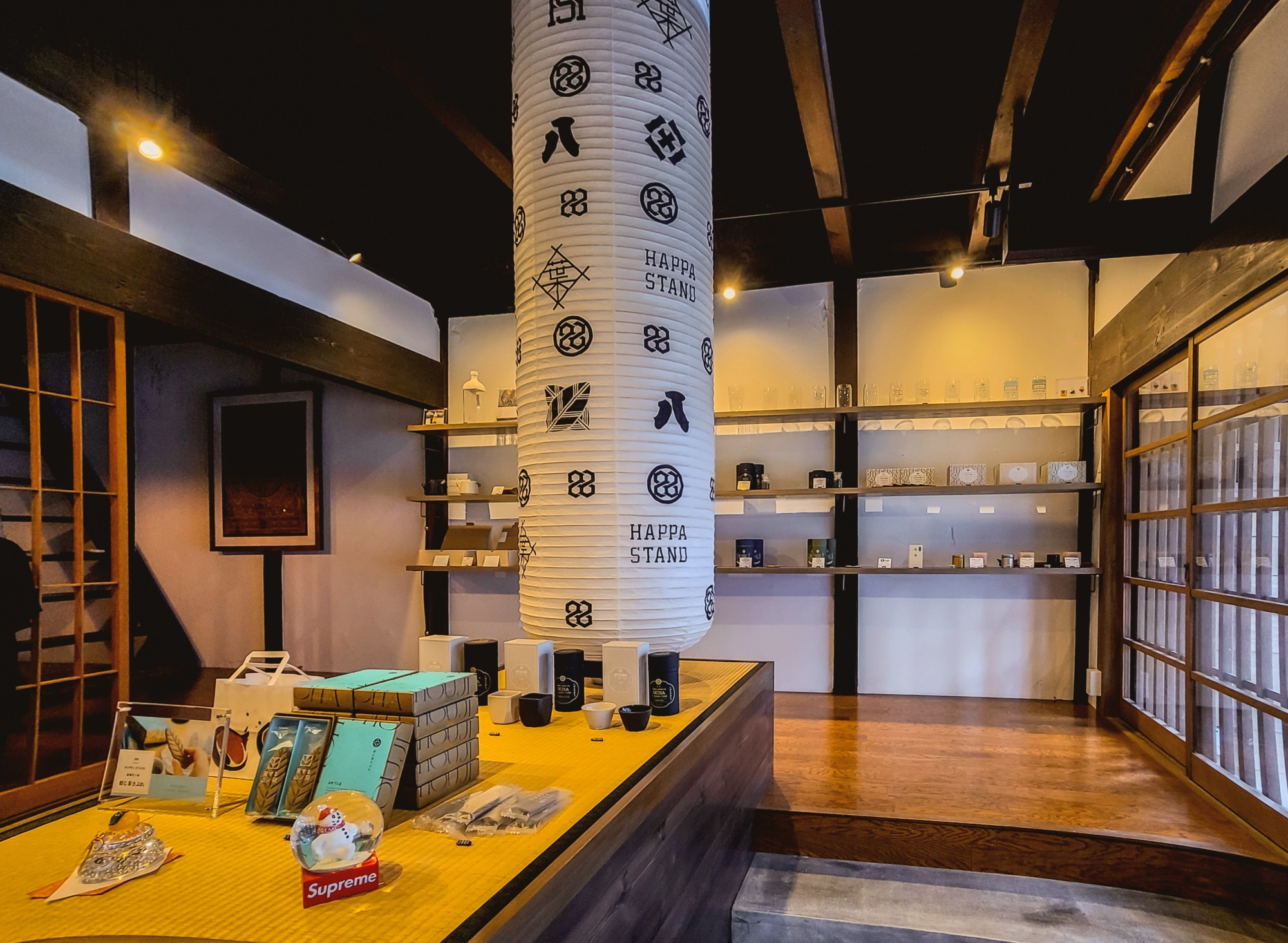 天井から吊るされた提灯が一際目を引きます。農薬を使用しないオーガニックの日本茶や、型からデザインをしたオリジナルの美濃焼の器が販売されています。