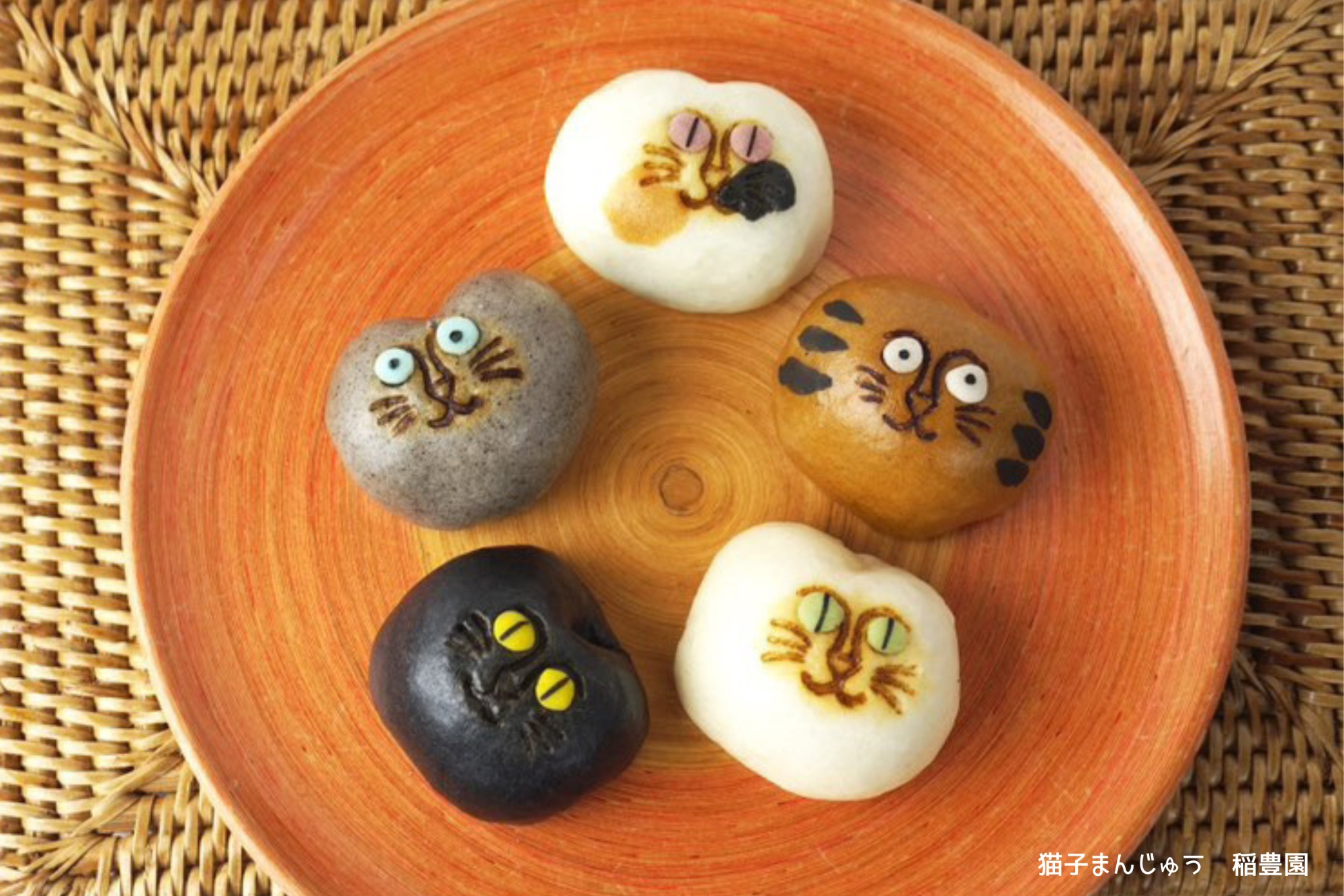 「猫子まんじゅう」は、老舗和菓子屋「稲豊園」の人気商品の一つで、店の隣の路地裏で暮らすノラ猫達をイメージして作られたおまんじゅうです。