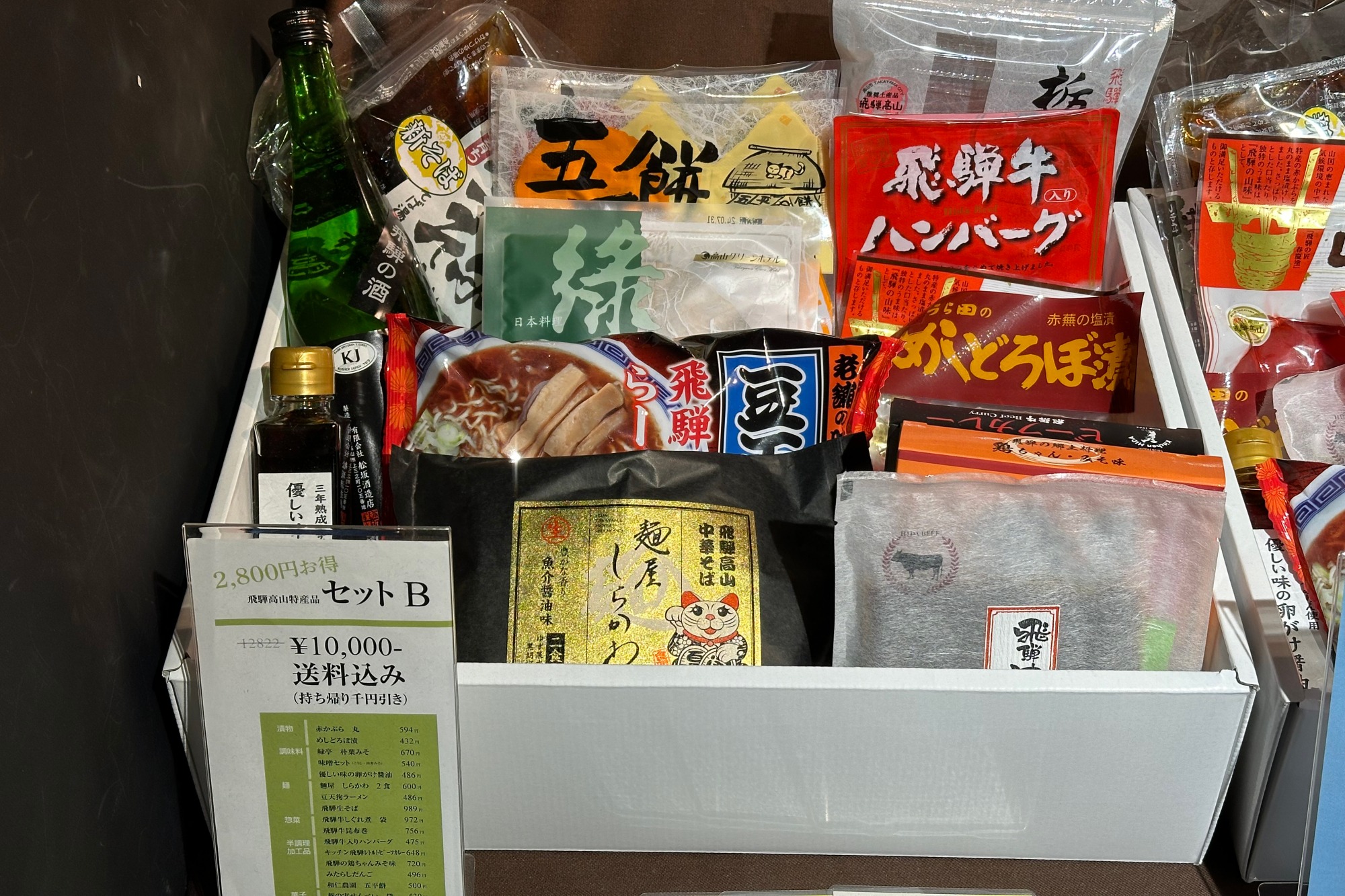 「飛騨物産館」の入口から入って正面あたりに、箱詰めセット見本がたくさん展示されていますので、ぜひご覧ください。